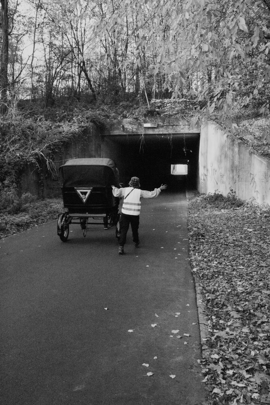 In November of 2022, I set out on a human-pulled carriage tour with experiment participants Steven Ben Slama, the main carriage puller; Patrick Schild, carriage puller and navigator; and Nuala Cavanagh, carriage puller and interface with the public. I also pulled the carriage, photographing and filming the experiment at moments less critical to the carriage’s operation and passage, which is why there are few photographs on hills, on highways, or in traffic. The documentary photographs form a sequential timeline running along the bottom of this exposition, unlike the photographs above the section headings, which, if considered alongside the text, might evoke Eisenstein’s ‘third something’, projected onto the mind of the spectator (1957: 7–11). While the photographs document a contemporary space and time, they are in dialogue with the picturesque, converging with and diverging from its aesthetic principles. The picturesque, connate with modern perception, cannot be circumvented, as it is intrinsic to the way we see, describe, and compose the landscape today.