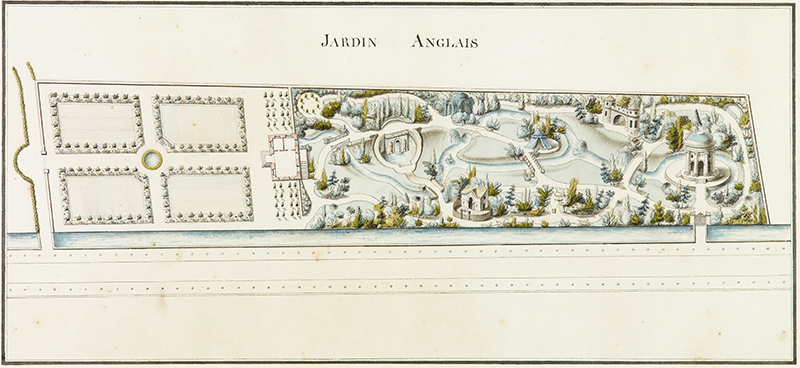 Figure 2. Anonymous, Jardin Anglais, c.1785, pen and ink with watercolour. The eighteenth-century picturesque garden, also known as the landscape garden, or English garden, epitomized the notion of the landscape as a picture, of nature perfected through human intervention. This depiction exemplifies the varied, irregular, and unpredictable elements of the picturesque, with a circuitous passage through garden features, fabriques, and follies in a dynamic progression, the garden’s sinuous paths opening out onto unexpected, picture-like prospects. This delusive expansion of perspective evinced surprise and sensory disorientation, a requisite for changing consciousness, demonstrating the picturesque garden as a locus of perceptual transformation and deception (Squires 2023: 184).