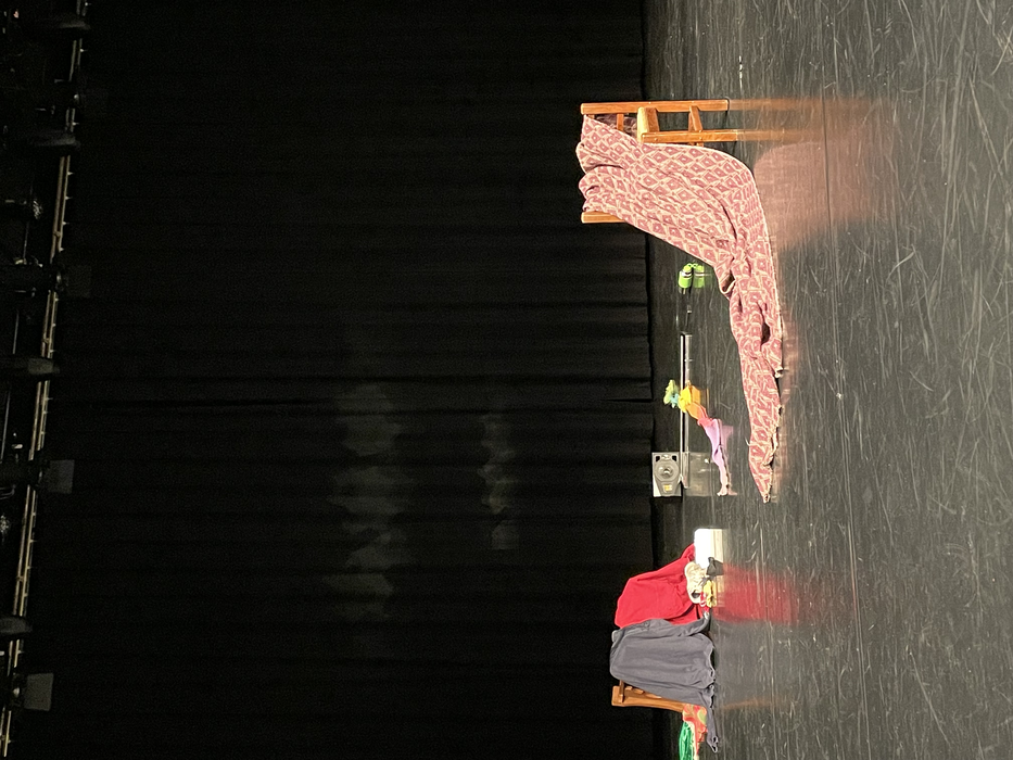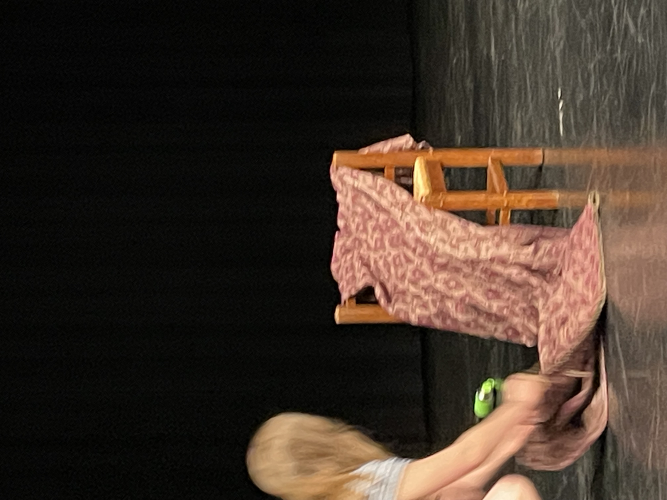 The reworking of my solo and solo bis was turbulent for me. Firstly, because there were only four weeks between the presentation of solo bis and solo trits, so I felt stressed by the limited time. Secondly, my grandma died just one and a half week before the solo trits presentation, and this had a huge impact on the meaning of the solo for me. My grandma passing away made me feel totally ungrounded, I felt super energetic in a bit too intense way, I could not sleep well and I was very emotional. I channelled this state of being into the solo. It was still based on the props from my room, but this time I organised them in a chaotic way, and I imagined that they were inside my grandma’s house. There had been an imaginary storm in her house, causing the furniture to fall into a messy order, and she herself had fallen down the outdoor stone stairs. She ended up lying on the ground, and in that position of an accident, I started the solo.