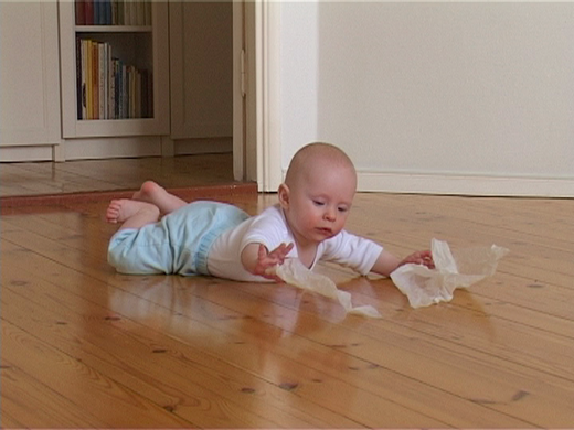 I saw a beautifully uncoordinated choreography of waving, lifting toes, opening the mouth, kicking, rocking. I saw an attempt to consume objects, uncertain of their purpose.