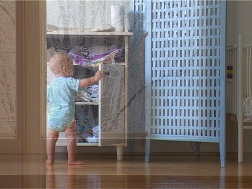 Kokeilin äsken sitä, että ikkuna kuultaisi koko ajan muiden kuvien alta. Ei toimi. Kiinnostavaa ei nimittäin ole kuvien päällekkäisyys sinällään vaan muutos. Hitaasti vaihtuvien ristikuvien aikana näkymä muuttuu koko ajan. Ikkunaruutuun ilmestyy huonetila. Pimeään käytävään alkaa tulla luonnonvaloa. Nukkuvan lapsen peittää lumisade.