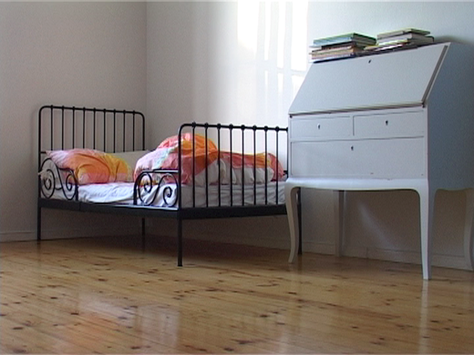 Rehellisyyden nimissä täytyy sanoa, että kodissamme ei ole aivan niin siistiä kuin video antaa ymmärtää. Kuvatessani minulla on tapana “stailata” todellisuutta kameran edessä, järjestellä sitä klassisten sommittelusääntöjen mukaan. Toinen syy puhtauden vaikutelmaan on se, että pöly, sormenjäljet ja muut elämän merkit eivät yksinkertaisesti näy suhteellisen matalaresoluutioisessa videokuvassa – varsinkaan silloin, kun on kyse laajasta yleiskuvasta. Ja suurin osa Kahden huoneen ja keittiön kuvista on tuollaisia avaria, taulumaisia näkymiä. Kuvarajaus korostaa omalta osaltaan tilan tematiikkaa. Lapsi nähdään kaukaa, osana huonetilaa, joskus jopa jonkin esineen takaa. Usein hän on myös selin kameraan, mikä tuntuu abstrahoivan hänet, tekevän hänestä vähemmän yksilön ja enemmän ihmisen kuvan.