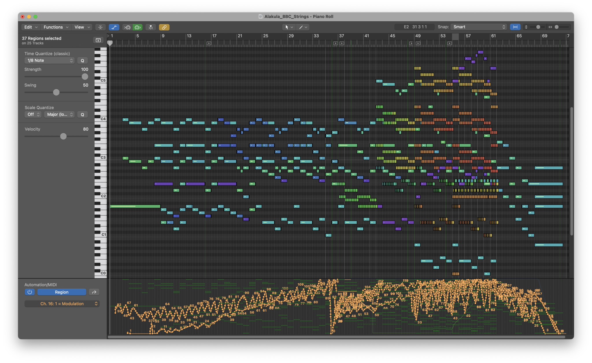 After establishing the lament bass, I expanded the notes into a basic harmonic form, thereby foreshadowing the chord sequence, which eventually develops into the chord structure of Am, E, Em, D, F, E and will be repeating throughout the whole piece, except for the textural turning point that arrives at 01:33 in the final audio file.