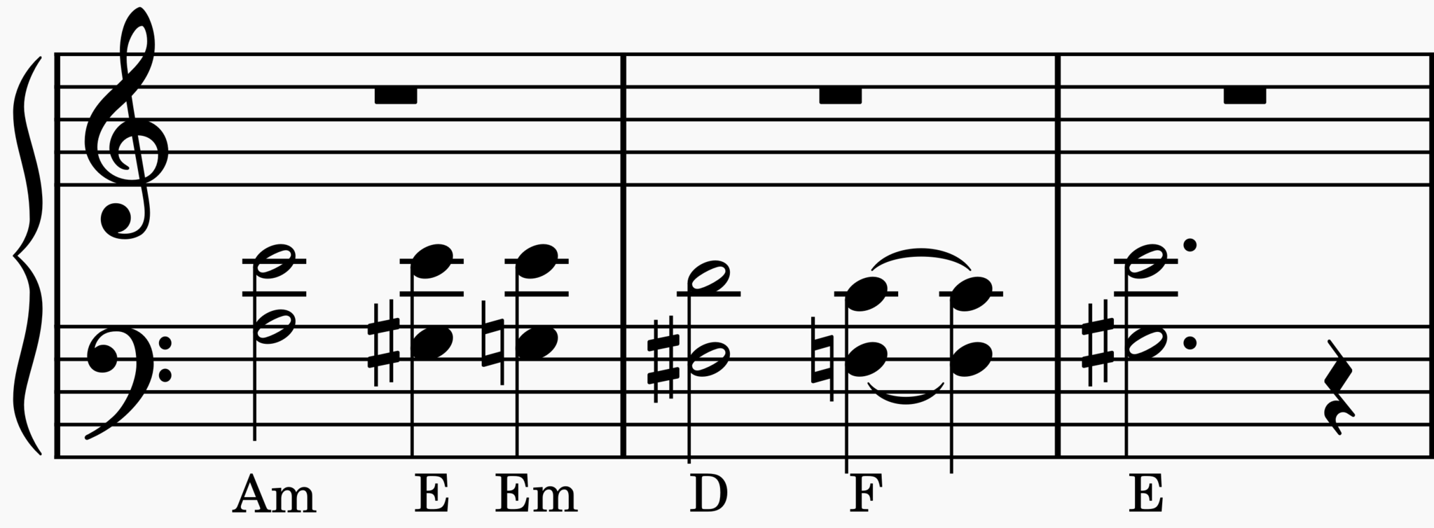 In musical works characterized by the sustained repetition of a singular sequence, any deviation from that pattern becomes particularly impactful and recognisable. As observed in Barbara Strozzi's 17th-century composition (Strozzi, 1659), Lagrime Mie, the moments of departure from the recurring form provide a sense of ease, where “the music breathes here, lightens and for a moment tries to escape the strictures of its own form” (Listening In, 2022; 5:01). In my own work, I sought to emulate this principle of deviation, creating a 'breathing moment' similar to Strozzi's. This moment serves as a foreshadowing to the subsequent development of a more adventurous texture and rapid musical expansion, suggesting a deliberate inhalation before a more powerful and impactful exhalation of the music that follows. I achieve this by altering the chord sequence to Am, E, Em, D, F, C, E.