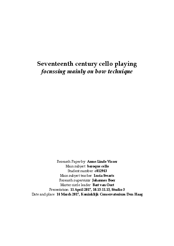 Name: Anne-Linde Visser Main Subject: Baroque Cello Research Supervisor: Johannes Boer Title of Research: Seventeenth century (Italian) cello playing, focusing mainly on bow technique Research Question: How can we regain seventeenth century bow-technique for cello repertoire? Summary of Results: My aim for this research was to find out more about 17th century cello playing, with the focus on bow technique. The first cello treatise was not written until 1741 (Corette) and therefore most cellists will play this repertoire with a late 18th century (bow) technique. Repertoire which is written especially for the violoncello starts in the late 17th century, but a lot of this repertoire was still composed in the old style. In short, my research contains the following elements: the bow, the bow-hold, bow-technique and other sources on articulation. The sources used include mainly treatises and iconography (taking into account that not all iconography is appropriate). Iconography shows us that there are a lot of possibilities to play the cello. In terms of bow hold, underhand bow hold is seen the most, but also overhand bow hold can be seen towards the end of the 17th century. The treatises by Sylvestre Ganassi, Riccardo Rognioni and Francesco Frognoni, were my main sources for bow-technique. Ganassi (16th century) already gives some very important ‘rules’ on string-playing that are still applicable today. Written in even greater detail concerning articulation, are the treatises for wind instruments. In my opinion, those treatises are not only valuable for 17th century repertoire, but could be also a source of inspiration for any other repertoire. Biography: Anne-Linde Visser (The Netherlands, 1992) studies baroque cello with Lucia Swarts. Last year she studied with Jonathan Manson at the Royal Academy of Music in London (Erasmus Exchange). Anne-Linde is ‘Young Bach Fellow’ of the Nederlandse Bachvereniging and member of the Theresia Youth Baroque Orchestra (Italy). Besides that, she regularly performs with the Laurenscantorij, Ars Musica and the Dutch Baroque Orchestra. With the Castello Consort she was recently accepted to take part in the Eeemerging-programme. She especially enjoys playing basso continuo, which has been described as ‘excellent’ (Early Music Reviews) and ‘impressive: unobtrusive yet decisive’ (Opera Today).