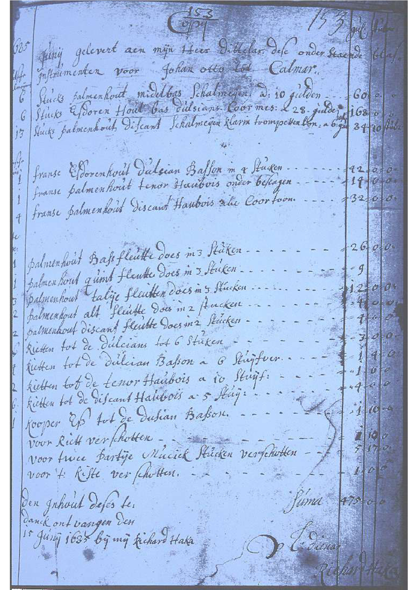[6] Haka, Richard, ‘gelevert aan mijn Heer Dittelar dese onderstaende blasinstrumenten voor Johan Otto tot Calmar’, Invoice, 15 June 1685, Amiralitetskollegium, kansliet, Krigsarkivet, Täby: Riksarkivet i Täby, Series E II a (2).