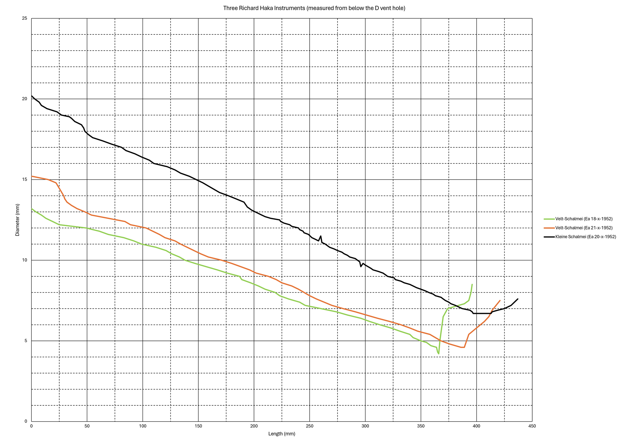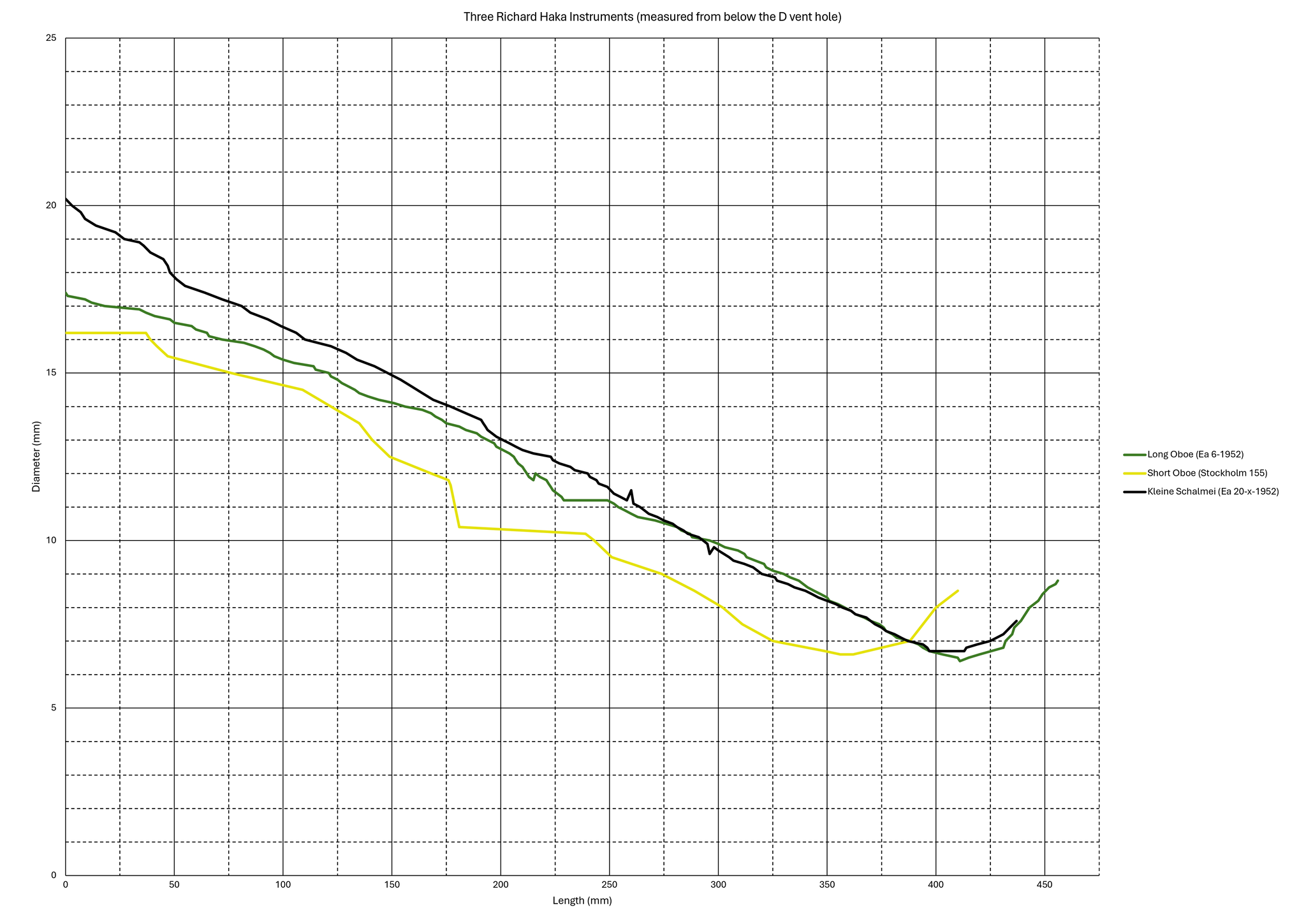 The kleine schalmei, despite its top joint bearing some resemblance to Haka’s oboes’ outer profile, also functions differently to an oboe. And despite the kleine schalmei playing well at A±0, the bore profile of its top joint is more similar to that of the longer A+1 oboes,[70] rather than the A±0 oboes[71] (Figure 2.4.3). Although its acoustic length is longer than that of Haka’s A±0 oboes, the kleine schalmei’s tone holes are very large (like a shawm) and would make the pitch high enough to play in A±0.[72] The kleine schalmei’s lowest note is a C♯4, unlike the oboes’ C4.