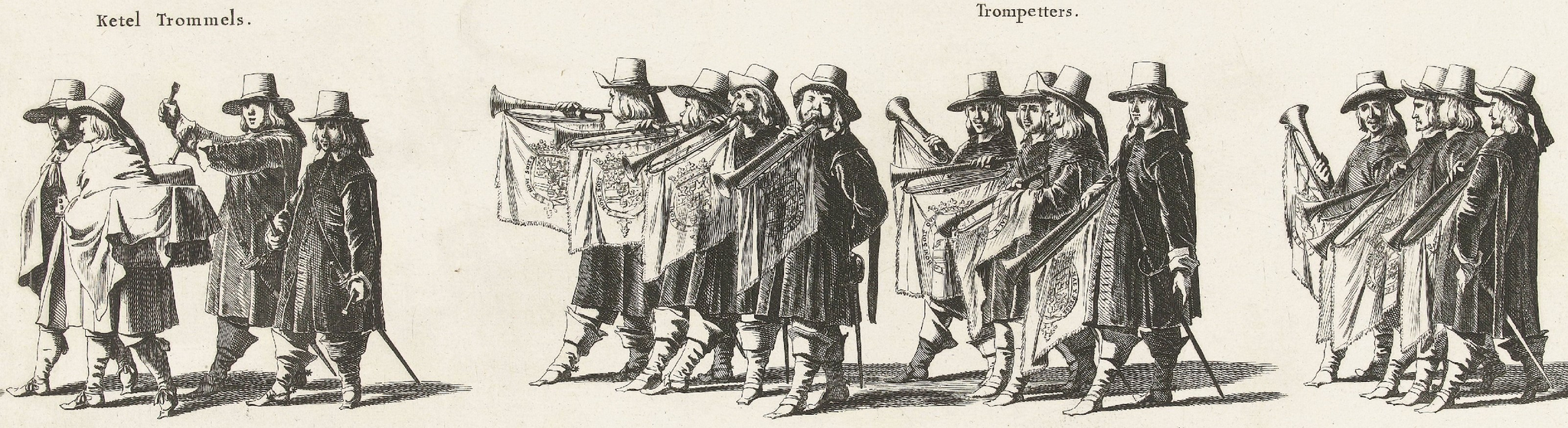 Throughout England and the German-speaking parts of the Holy Roman Empire in the period of study, the main military and outdoor ensemble seemed to be the double-reed bands, whether that be with Deutsche schalmeien or French oboes.[6] The Republic differed in this regard, as the favoured ensemble — for the most part — was the trumpet band; several trumpets and drums (Figure 6.1). Most examples of double-reed performances relating to the Republic within a military context are of English and Scottish musicians, certainly due to William III ruling as both King of England, Scotland, and Ireland and as Stadtholder of Holland, Zeeland, Utrecht, Guelders, and Overijssel. As close by as Flanders, double-reed bands were more-commonly used, sometimes together with trumpet bands![7]