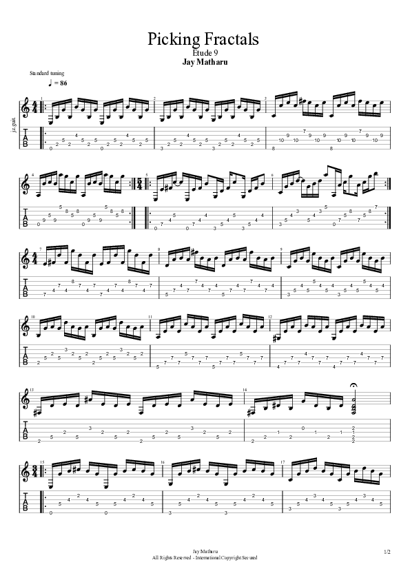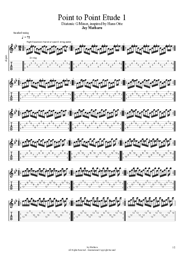 This was the first of several mini technical etudes, developed after locating multiple instances where the same fractal shape occurred within the G major scale. The aim was to create a musical paragraph using solely idiomatic pattern based composition that could also serve as a vehicle for technical development, in this case the etude provided a challenge for executing sweep picking in a very controlled manner. The first motif alternates between fractals in a descending fashion across string set 1-3 before leading to a second shape on string set 2-4, where the shape alternates, ascending and descending.