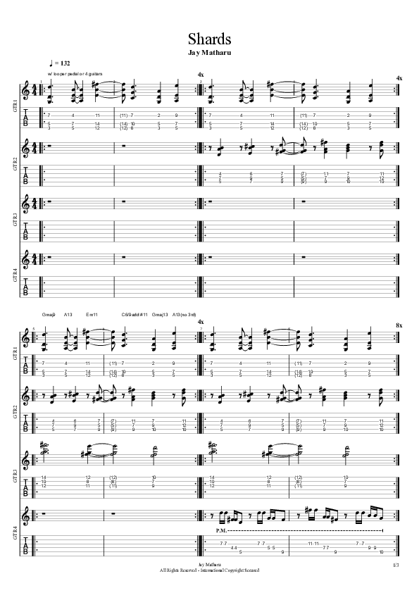 Explorational practice with only fractals led to the composition of this piece Shards. In the session multiple ideas presented themselves but one specific motif caught my attention. The original motif is based on fractal where two notes make a powerchord on the E and A strings, with the third anchor point, a melody tone placed on the G string creating a string skip.