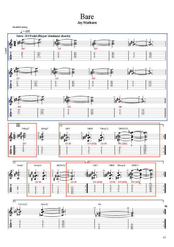 Mindlessly noodling on autopilot whilst simultaneously watching TV, I stumbled upon an intriguing chord sequence which was based around Vitchev’s voicings, this also included a modification of a regenerated voicing. I wrote the sequence down in GuitarPro, put it in my folder of musical sketches to revisit at a later stage. This discovery became the base for the A section of Bare, surprisingly the melody organically emerged from within the chord progression. In bar 31 the chord is labelled with a question mark, as unfortunately I cannot trace the origin of this voicing, I can only speculate that as my harmonic knowledge has broadened in recent months that my intuition for finding voicings has also developed.