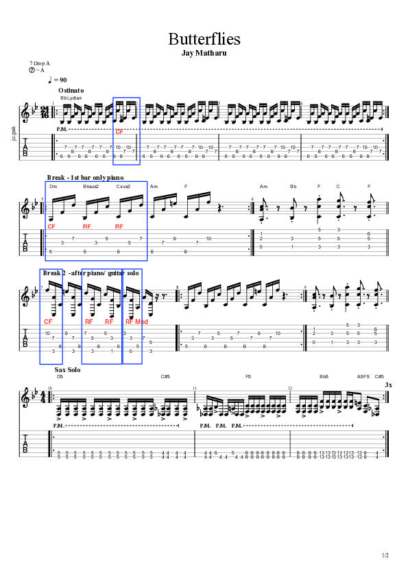 Late at night and I was noodling unplugged on the couch. I took a short break and started musing on the sensation of nervous excitement, also expressed as "butterflies in the stomach." I sat down again, picked up the guitar and this very simple riff presented itself, it was just an arpeggiating major 7th chord alternating with a central fractal in 3/4 time. I notated the idea and came back to it the next day with fresh ears. I picked up the riff where I left off and after some time I felt like the riff needed to capture the unpredictability of that anxious feeling, so I tested playing it in 5/4 and then 11/8. I had settled on 11/8 time and commenced the search for a B section, however due to technical difficulties with my recording software I abandoned the idea until the next day. In the third exploratory session the riff underwent another transformation. I played the ostinato in several different ways until I decided it worked best in what I conceived as 21/16, grouped as 5+5+5+6.