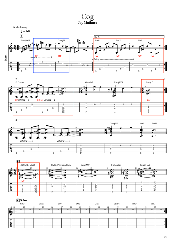 Cog started of as a simple two chord idea, later developing into three chords. At first I was exploring how different LCR voicings could be transposed between two key centres as constant structures. This naturally evolved into using the two chords (B major and G major) as anchor points and finding ways of connecting them through both LCR voicings and fractal movement. All the compositions have some element of Vitchev's concepts adapted to my personal style, but Cog was the first to exhibit a cohesive amalgmation of multiple concepts.