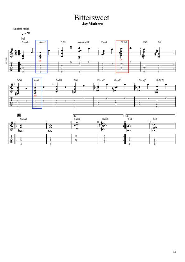 The main idea to Bittersweet came together over one long practice session, which started with exploratory practice evolving into a deliberate practice session, where the ideas were refined. The motif started with a conventional C6 voicing in open position, by revoicing this into a second inversion C major triad and highlighting the major seventh instead of the sixth as a melodic pivot, the piece began to take shape. From that point, the melody and harmony evolved organically, each element leading to the next. I decided to keep overall form simple, following a classic head–solo–head structure found in jazz compositions. Chordal textures throughout the piece draw on a mixture of drop 2 voicings, string skipped fractal shapes and LCR voicings. The title, Bittersweet, originates from the feeling I had when I wrote it, contrasting tonal and emotional qualities, balancing ambiguity with motion and stillness.