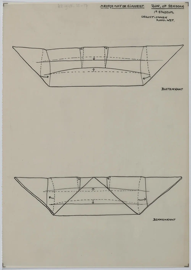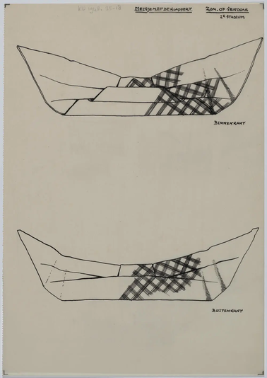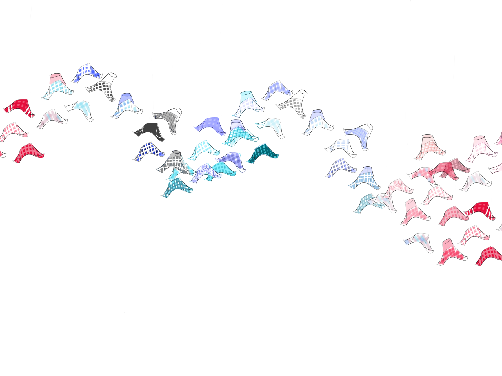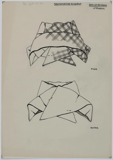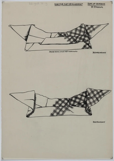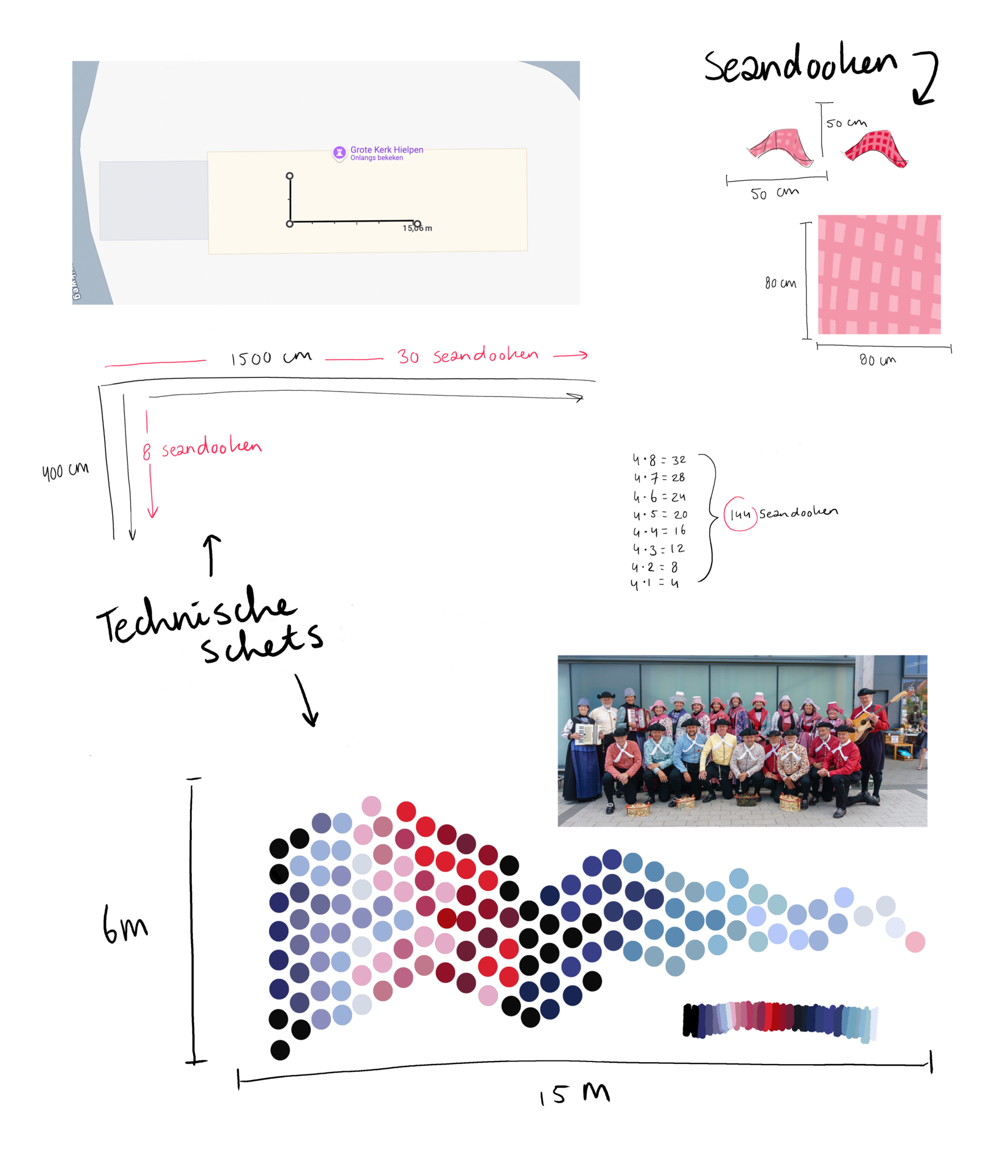Ook heb ik nagedacht over een beeldende interpretatie van ‘een golf’ uit de Zuiderzee in klederdracht. Gesteven séandooken (met bûnte mûtse) in Oost-Indisch bont en kleurrijke sitsen wil ik als kleurrijk geheel in de vorm van een golf hangen in de Hervormde kerk van Hindeloopen. De kleuren geïnspireerd op de verschillende fases van een Hylperse vrouw, waarin ik zowel de zeven rouwfases als de bruidskleuren: melk en bloed, en de kindermuntjes van sisten gebruik. Een schakeling van kleuren dat een verhaal over deze kleine stad verteld