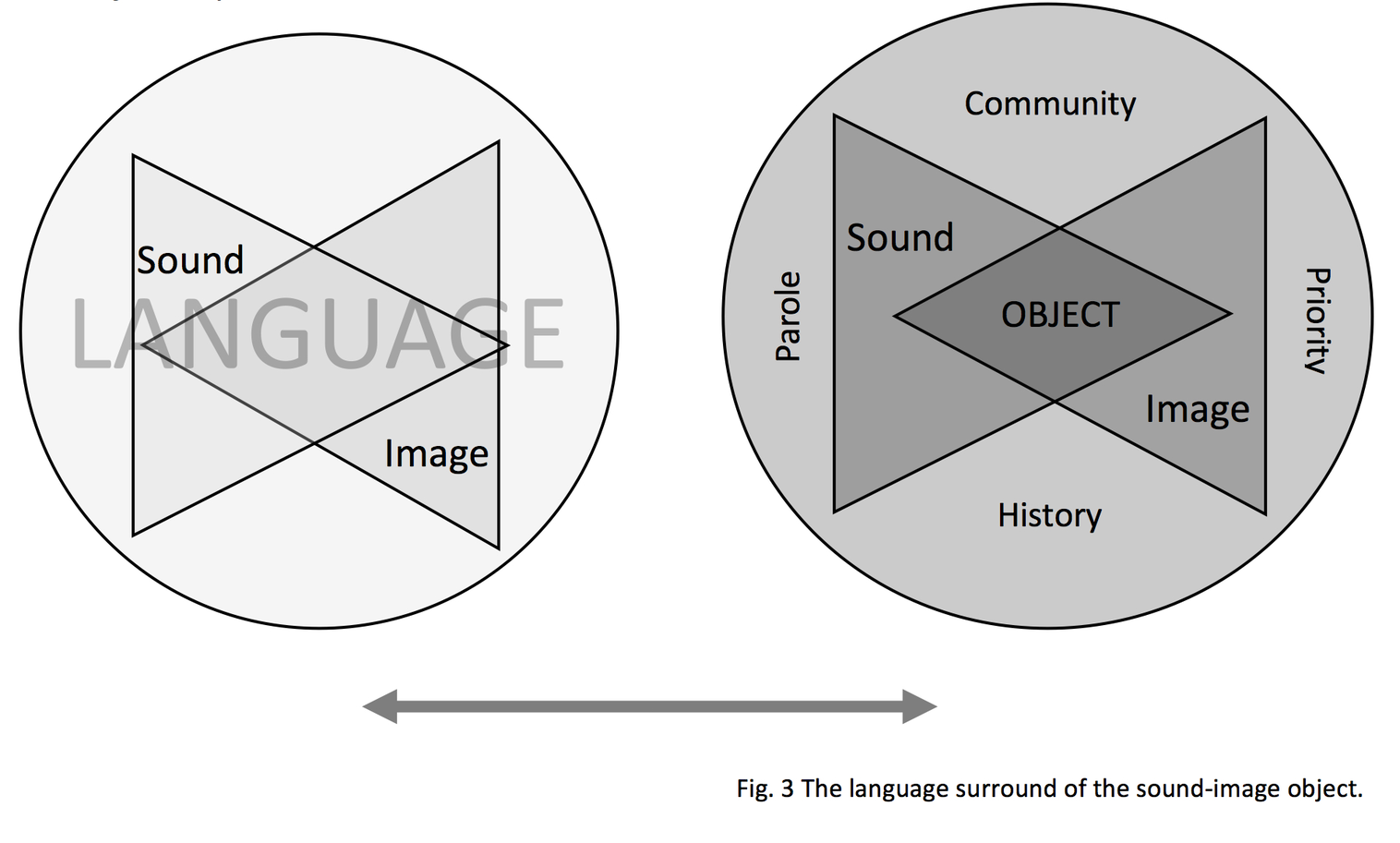 Intra-action. As opposed to interaction, which assumes the retention of independence between the objects, intra-action proposes that agency does not pre-exist, but emerges from the relationships in intra-actions, “cause and effect emerge through intra-actions.” (Barad, 2003, p. 176) The agency of the {Sound-Image-Language} object comes forth from our intra-action with it, a performative act that calls meaning into being. It is where the “boundaries and properties of the “components” of phenomena become determinate” (Barad, 2003, p. 815). For Barad we are constantly reconfiguring our relationship with the world and materialising objects as we intra-act with them.