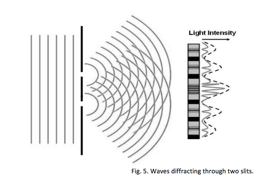 Diffraction. “Diffraction can serve as a useful counterpoint to reflection: both are optical phenomena, but whereas the metaphor of reflection reflects the themes of mirroring and sameness, diffraction is marked by patterns of difference”. (Barad, 2003, p. 71) Barad takes the idea of diffraction from Haraway; “Diffraction patterns record the history of interaction, interference, reinforcement, difference” (Haraway, 1997, p. 273) but goes much further in expanding the metaphor and in explaining its importance to thinking from an Agential Realist perspective. Diffraction is both the process and patterns that form when a wave bends around an object interfering with its trajectory. When a wave meets two slits however an interference pattern can be observed.