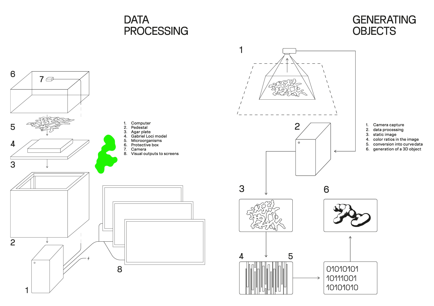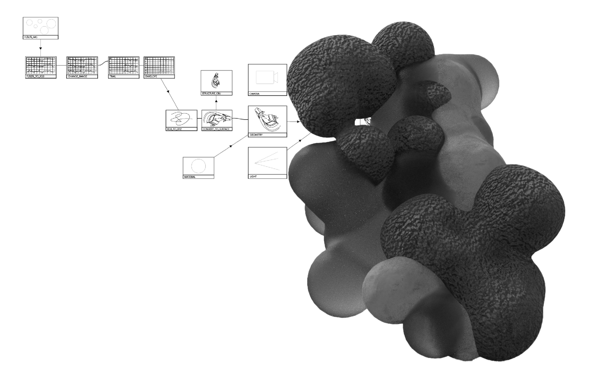 They are all united by an interest in environmental topics and conceptualize a multispecies ecology in their projects. Together, they created a model of the campus, which they inoculated with various impurities that they took directly from the university buildings. Then they let these organisms grow and filmed the entire project. RGB data was collected from the video, which was then converted to curves and transferred to XYZ coordinates, from which spatial objects in the form of metaballs were generated, subsequently creating various objects. It is an organic architecture that is generated by nature itself, completely uncontrolled by the human will.