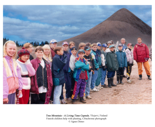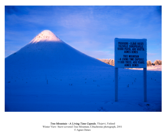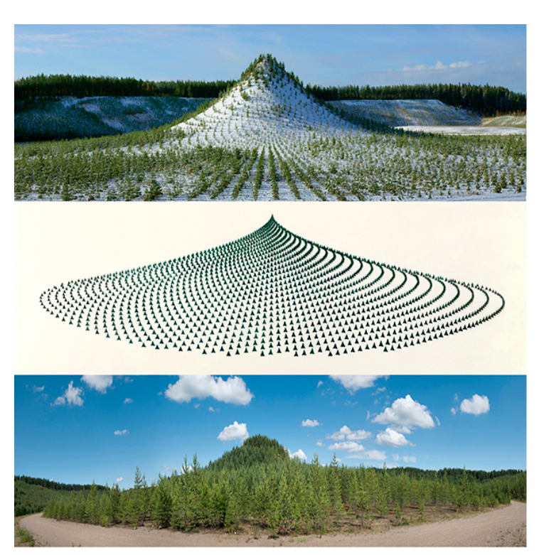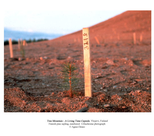 Tree Mountain (1996-*) was conceived by Agnes Denes as a plan for a pine forest ecosystem restoration in the Pinzio gravel pit near Ylöjärvi, Finland. The artwork became a long term contribution to an existing ecosystem. Denes’s work primarily focuses on environmental and ecological issues, often through site-specific installations that explore land reclamation, reforestation, and human interaction with nature. Denes conceived Tree Mountain in 1982 as a collaborative, environmental project touching on global, ecological, social, and cultural issues.