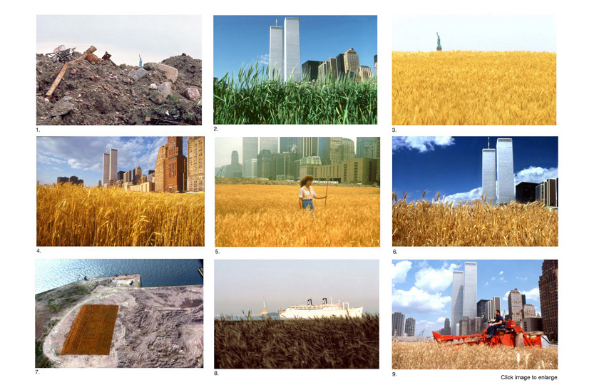 Several of her works have become temporal environmental realities, such as her piece Wheatfield—A Confrontation (1982), in which two acres of wheat were planted on landfill in downtown Manhattan.