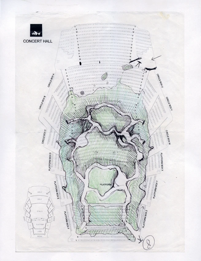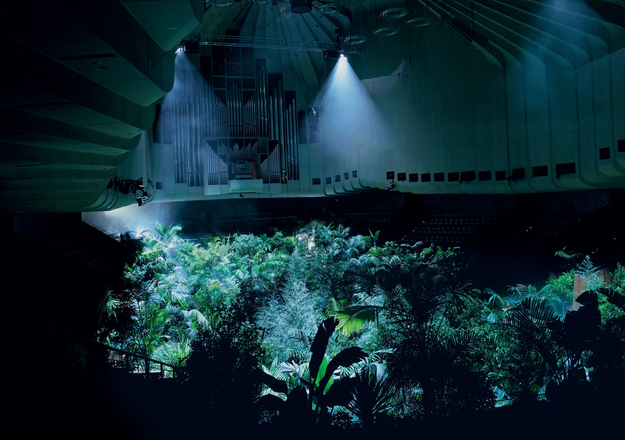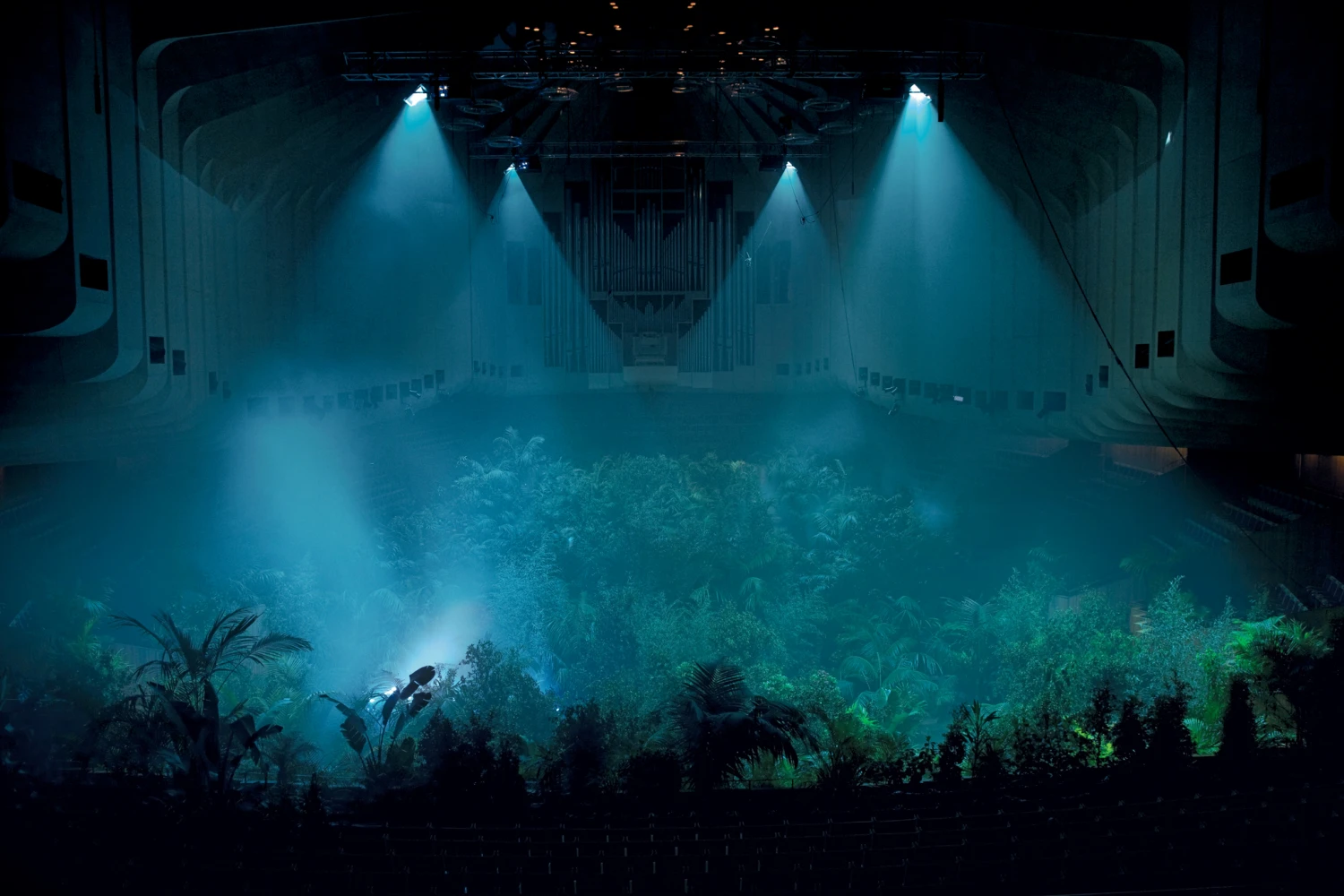 A Forest of Lines was commissioned for the 16th Biennale of Sydney. For 24 hours, the Concert Hall of the Sydney Opera House was transformed into a virtual forest, featuring over a thousand real trees and bushes—including lilly pilly, palms, ferns, and bamboo—, mist and soft moonline illumination. The flora along with a small stream and waterfall, were temporarily installed in the Concert Hall, replacing 900 seats to create pathways. Visitors navigated this immersive environment equipped with headlamps, exploring the dense landscape. Upon entering the space, visitors find themselves positioned above the installation, looking down at a mist-covered canopy with dawn illumination. According to Huyghe, this was the most striking image of Forest of Lines (2008) since perspective imbues the work with a science-fiction-like, almost magical quality.