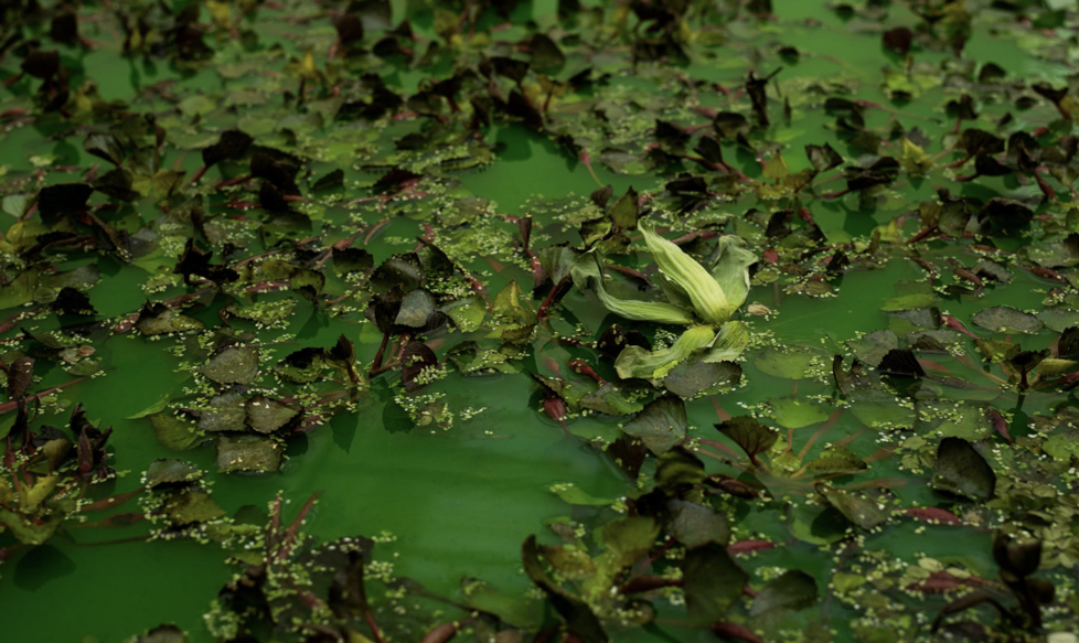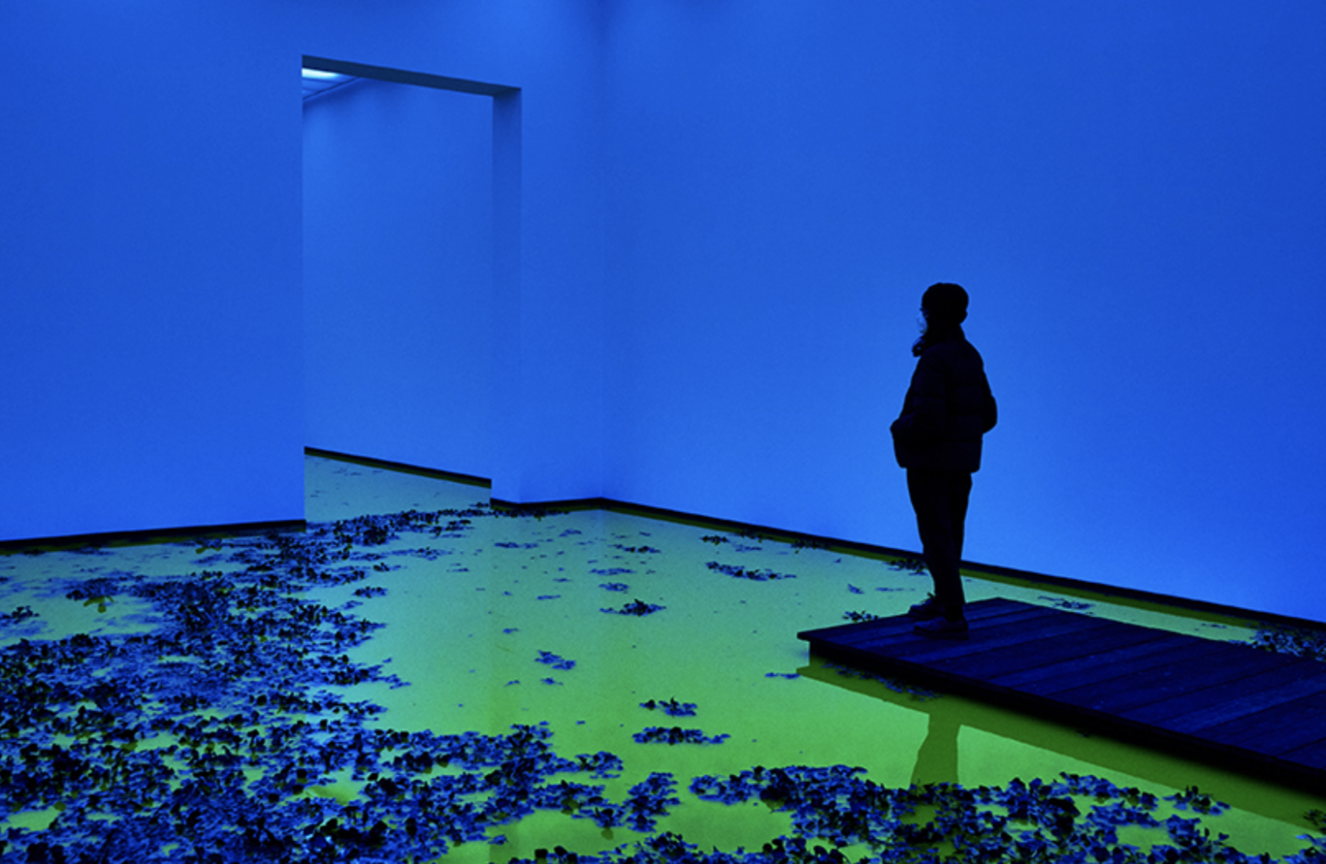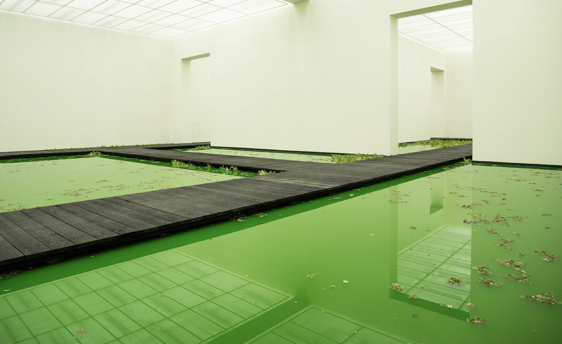 In 2021 the work Life from Olafur Eliasson was presented at the Beyeler Foundation in Riehen (Basel, Switzerland), transforming the museum into a living, fluid ecosystem by flooding it with water dyed an intense green. On the southern side of the gallery all windows were removed, allowing the adjacent water lily pond to extend into the building’s interior. Visitors could explore the space via wooden walkways built over the water and observe the pond from above. The artist introduced various aquatic plants, enabling them to grow within the expanded pond throughout the duration of the exhibition. The aquatic plants involved in the work* were a mixture in between original ones from the pond and new species. The green water was infused with uranine, a non-toxic dye commonly used to trace water flow, making its presence visually prominent. Different lighting effects, including white light and UV illumination at night, further enhanced the atmosphere giving the sense of stepping in an “alive” painting.