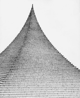 The Restless Pyramids create Self-Supporting City Dwellings that can sustain their inhabitants, and Space Stations and other pyramids of the future for space travel with flexible, self-regenerating and easy to repair units. This is the birth of giant Fish Pyramids for creating underwater habitats, or pyramids in the shape of an egg or a teardrop. They are created for a different world in which the inhabitants will live in space, hovering above Earth, or else live on Earth in self-contained, self-supporting environments. These structures are not science fiction, they are the product of high technology, yet another "perfection", that of the flexibility of natural systems. They have a look of freshness and vulnerability. They are the future and the future is always vulnerable and unused.