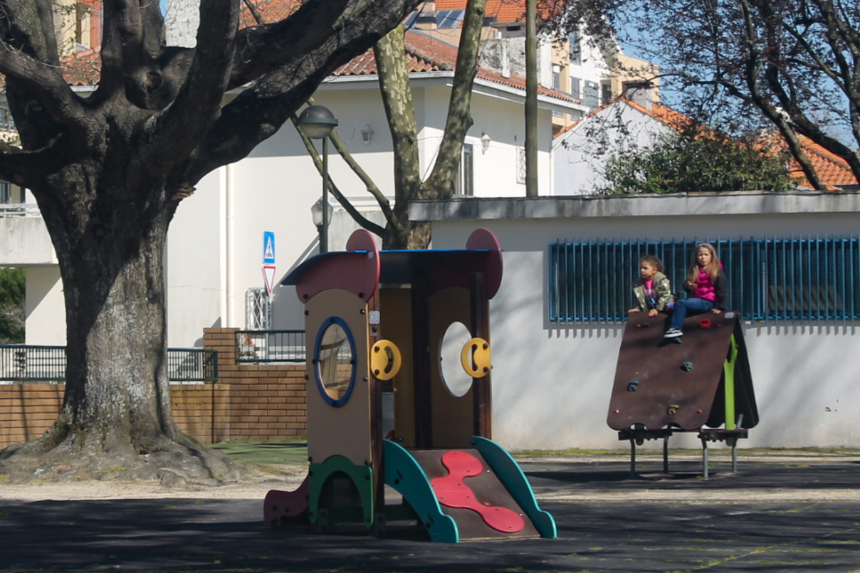 children playing in the courtyard, on their way to school