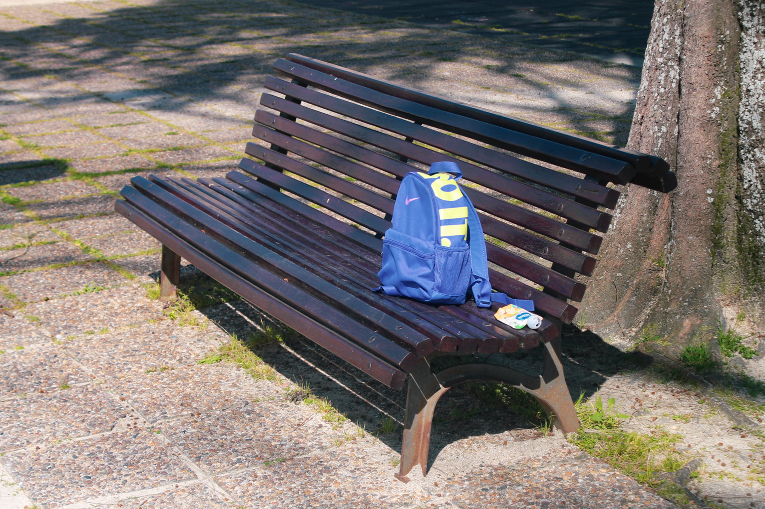 a backpack left on a bench