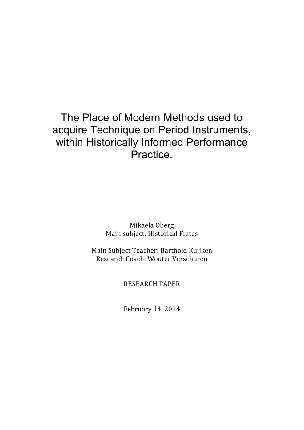 Name: Mikaela Oberg Main Subject: Historical Flutes Research Coaches: Wouter Verschuren Title of Research: The Place of Modern Methods used to acquire Technique on Period Instruments, within Historically Informed Performance Practice. Research Question: How has the way we acquire technique on the flute developed since 1700 and to what extent can the use of instructional methods intended for Boehm system flutes within historically informed performance practice be deemed valid? Research Process: The information for my research has come from a collection of over fifty treatises, methods and technical workbooks written between 1700 and 2013. My historical overview was based on a more in-depth analysis of just over thirty of these and I also interviewed twenty-seven historical flute players, of various ages and levels to acquire an understanding of the current approach towards technical development. Summary of Results: By examining a large variety of flute instructional methods written across three hundred years I have discovered that there is a continuous relationship in ideologies associated with the development of sound, articulation and finger technique on the flute. This continuity of ideas, combined with the results of my interviews with current student and professional historical flute players has brought me to the conclusion that it is quite valid for historical flute players to include methods intended for Boehm system flutes as part of their practice material. I have found evidence supporting the fact that eighteenth century flute players included technical exercises as part of a daily practice routine, apart from their repertoire practice. I have also found that the most popular and enduring exercises in use today, many of which us flute players know from our modern flute studies, have their foundations in material found in eighteenth and early nineteenth century method books. In my power point presentation I will offer various examples from my research material highlighting the development of technical material from 1700 to the present. This will display the links that exist between the old and the new as well as offer several often over-looked suggestions for flute players looking to expand their practice resources.