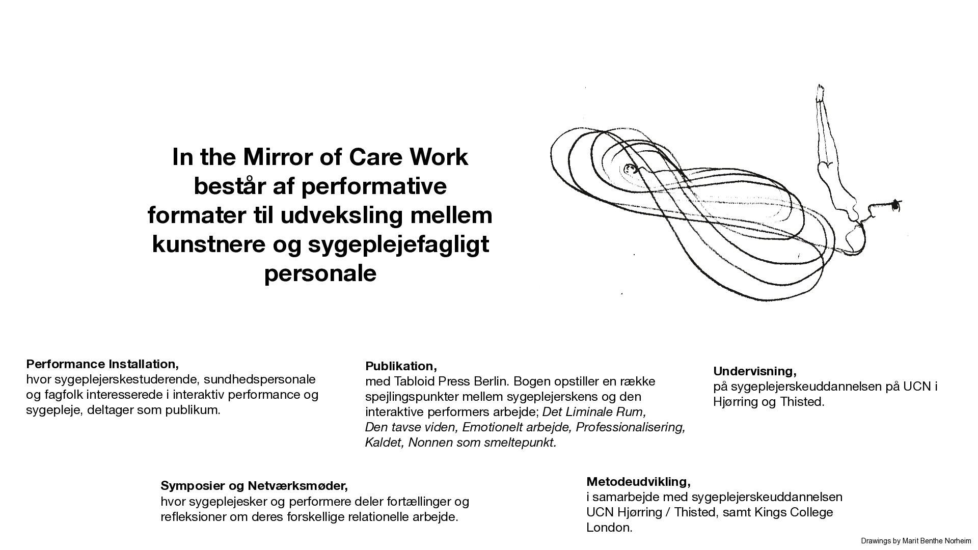 The performance is part of 'In the Mirror of Care Work’, a long-term project in collaboration with the Nursing School of UCN in Hjørring and Thisted. Since 2020 we have been exploring different formates for giving insight into our different yet, in many ways, similar field of relational work.
