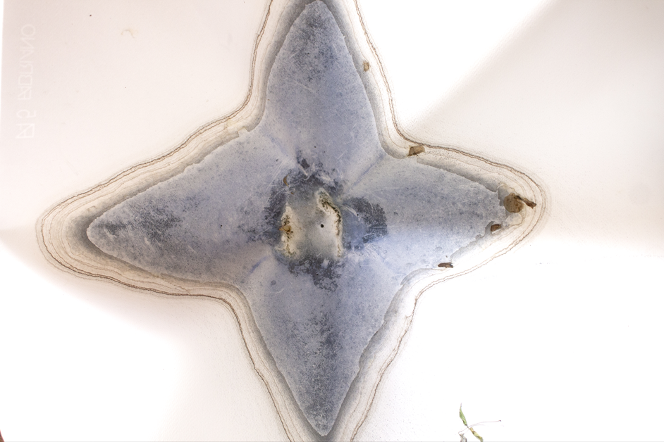 A square sheet was placed on the structure, containing a significant volume of water mixed with pigment. During the following week, the work was exposed to continuous rainfall. The structure remained stable until a particularly intense downpour caused it to collapse. The drying marks visible around the perimeter correspond to the gradual evaporation that occurred over the week, while the blue central area is the direct result of the fall — a concentration of pigment deposited upon impact.