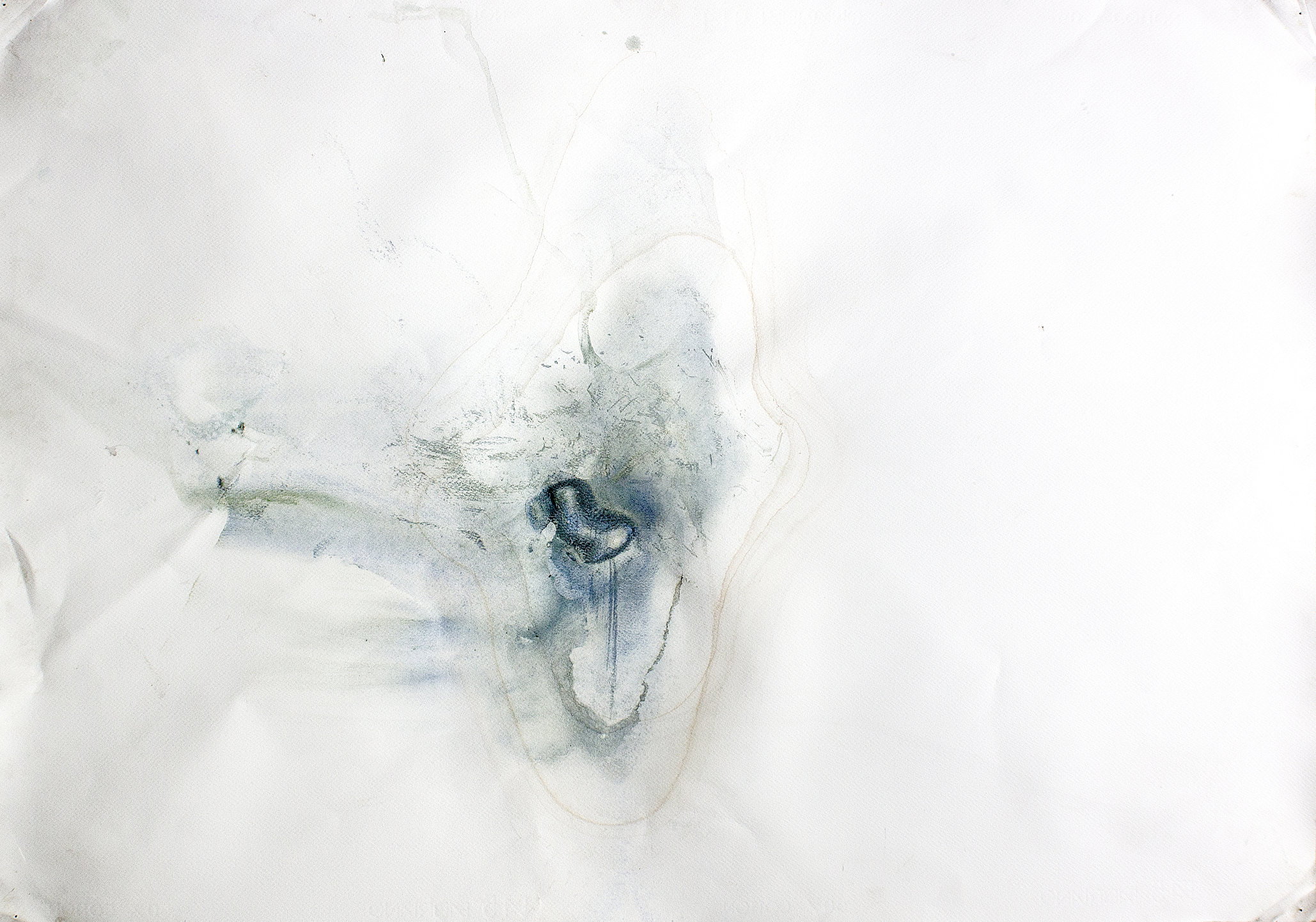 The work was initially placed on unstable structures, which supported only the sides or corners of the sheet. Without a rigid surface underneath, the sheet responded to the gravitational pull of its own weight, creating natural deformations. The addition of a stone further accentuated this process, intensifying the tension and distortion produced by gravity. Water mixed with pigment was then poured onto the surface, increasing the gravitational force acting upon the sheet due to the added weight of the liquid. Given the instability of the structure, the work fell three times, leaving visible traces of its fall. For me, the work found its completion precisely in this — in the marks left by its own history, shaped by chance, gravity, and material fragility.