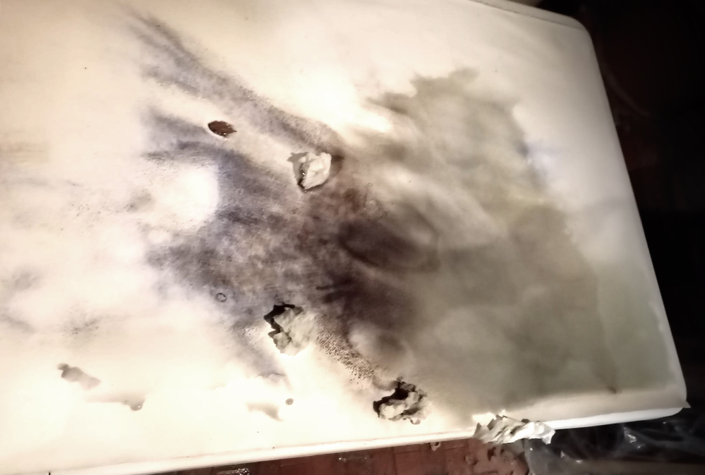 The sheet was placed on the fabric cover of a sofa, with stones positioned to apply localized pressure and introduce gravitational tension. Pigment was added along with water, creating a substantial pool that remained undisturbed for approximately three weeks. During this period, the pigment gradually settled, and the surrounding environment began to interact with the work. Notably, a small ecosystem formed around the sheet, including the presence of several ladybugs. Once the sheet was removed, the dried surface revealed layered traces of both material sedimentation and environmental interaction.