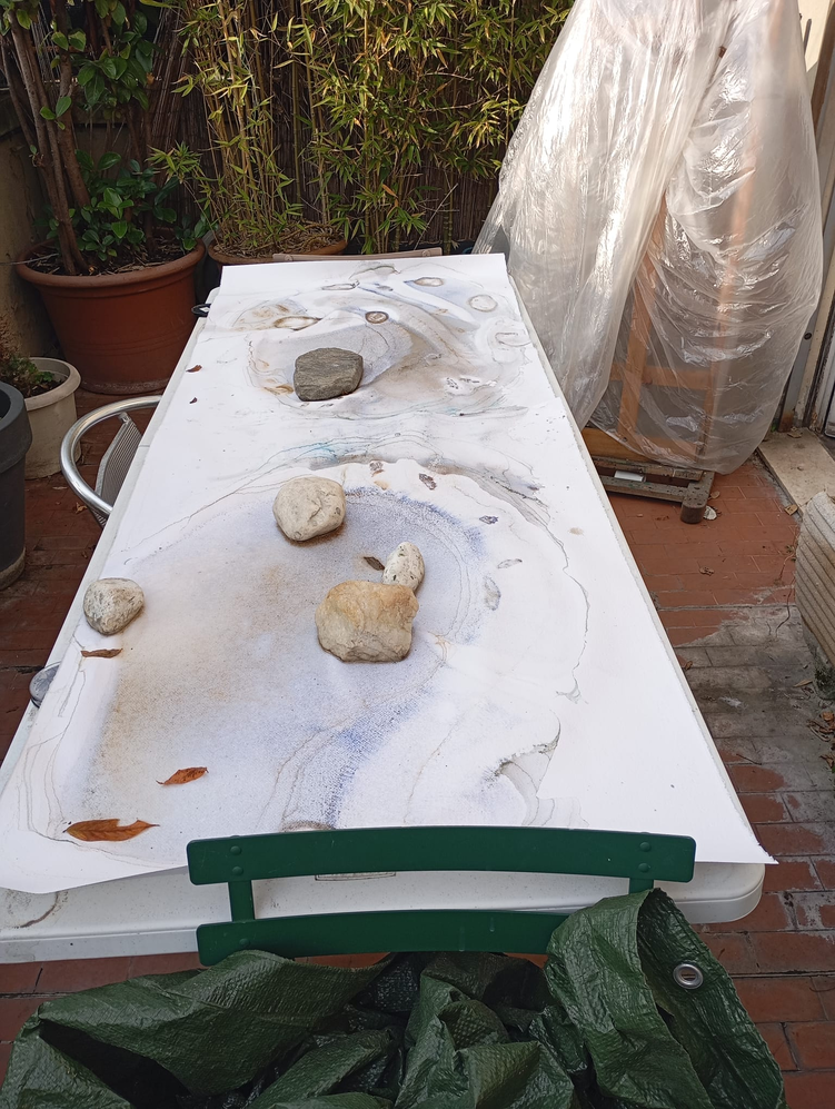 The image depicts the stage of the drying process of the sheets after exposure to atmospheric agents. The stones are used to retain water, thereby extending the drying time at those specific points. Furthermore, once removed, the stones leave a trace — a mark that establishes a relationship with the rest of the composition.