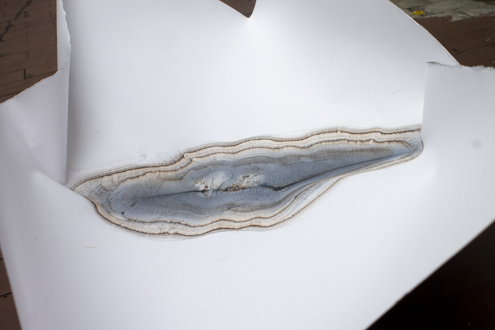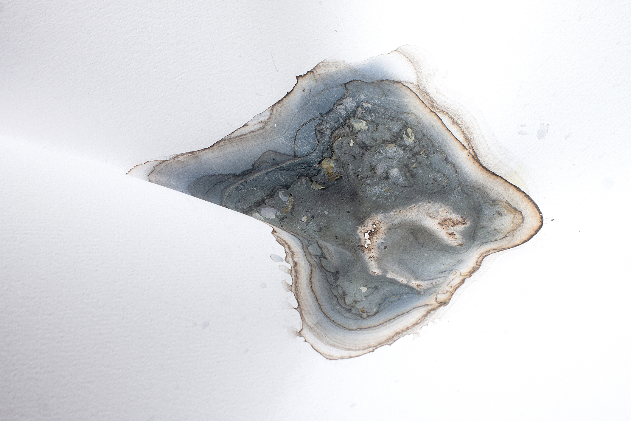 The work was initially placed on unstable structures, which supported only the sides or corners of the sheet. Without a rigid surface underneath, the sheet responded to the gravitational pull of its own weight, creating natural deformations. The addition of a stone further accentuated this process, intensifying the tension and distortion produced by gravity. Water mixed with pigment was then poured onto the surface, increasing the gravitational force acting upon the sheet due to the added weight of the liquid. Given the instability of the structure, the work fell three times, leaving visible traces of its fall. For me, the work found its completion precisely in this — in the marks left by its own history, shaped by chance, gravity, and material fragility.