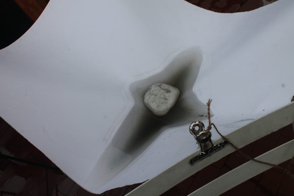 In this case, there is a change in the supporting structure: a rope, tied to an overhead handhold, horizontally anchors an industrial metal ring suspended downwards. From this ring hangs the sheet, with a stone placed at its centre, along with water and pigment. During the process, the work fell twice, leaving visible traces of the event — marks that became an integral part of the work’s narrative and material history.