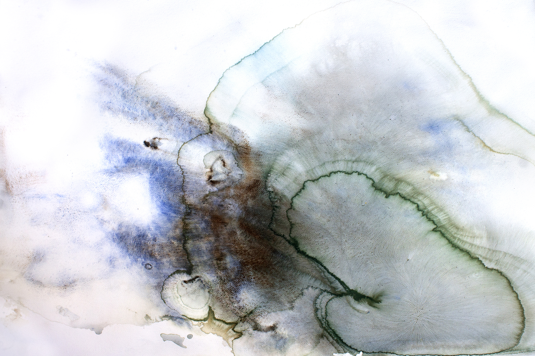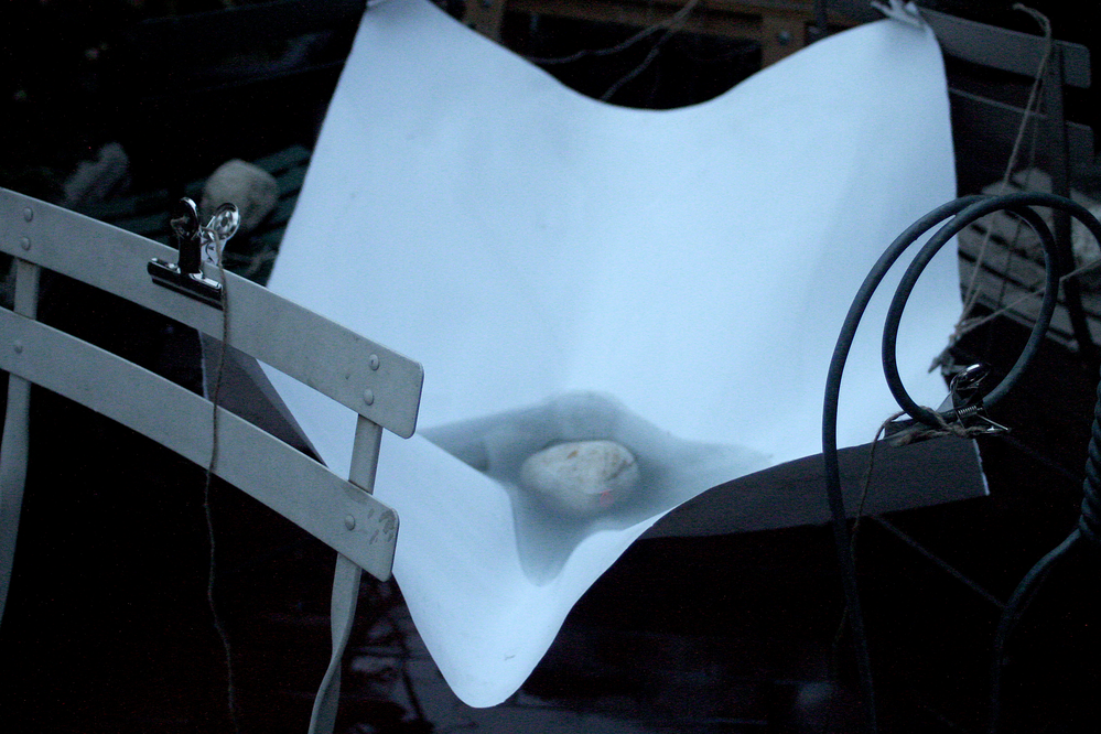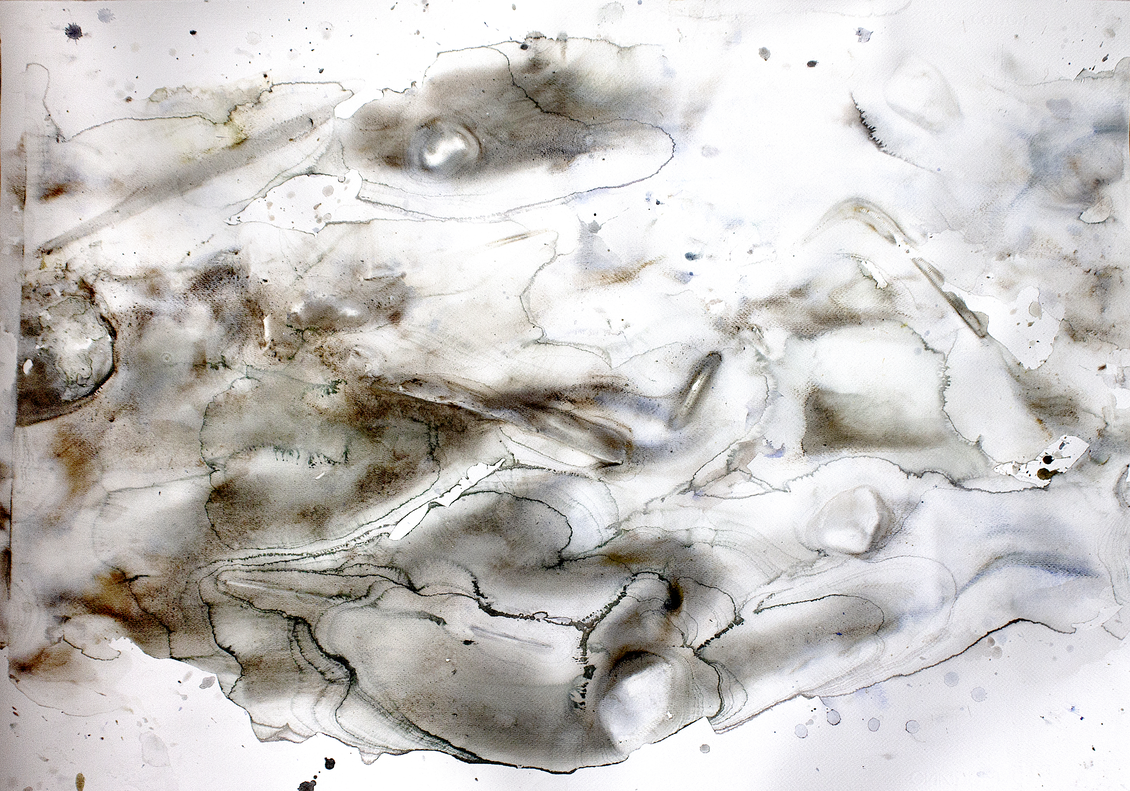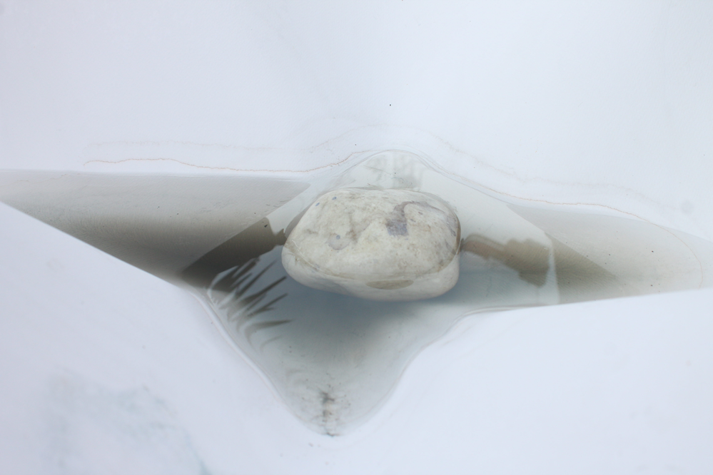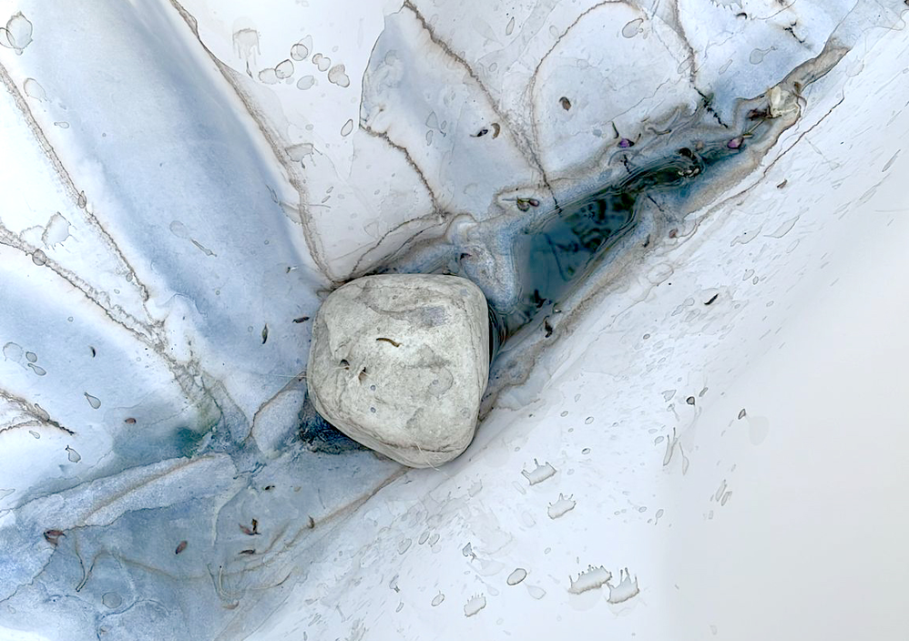 The work was initially placed on unstable structures, which supported only the sides or corners of the sheet. Without a rigid surface underneath, the sheet responded to the gravitational pull of its own weight, creating natural deformations. The addition of a stone further accentuated this process, intensifying the tension and distortion produced by gravity. Water mixed with pigment was then poured onto the surface, increasing the gravitational force acting upon the sheet due to the added weight of the liquid. Given the instability of the structure, the work fell three times, leaving visible traces of its fall. For me, the work found its completion precisely in this — in the marks left by its own history, shaped by chance, gravity, and material fragility.