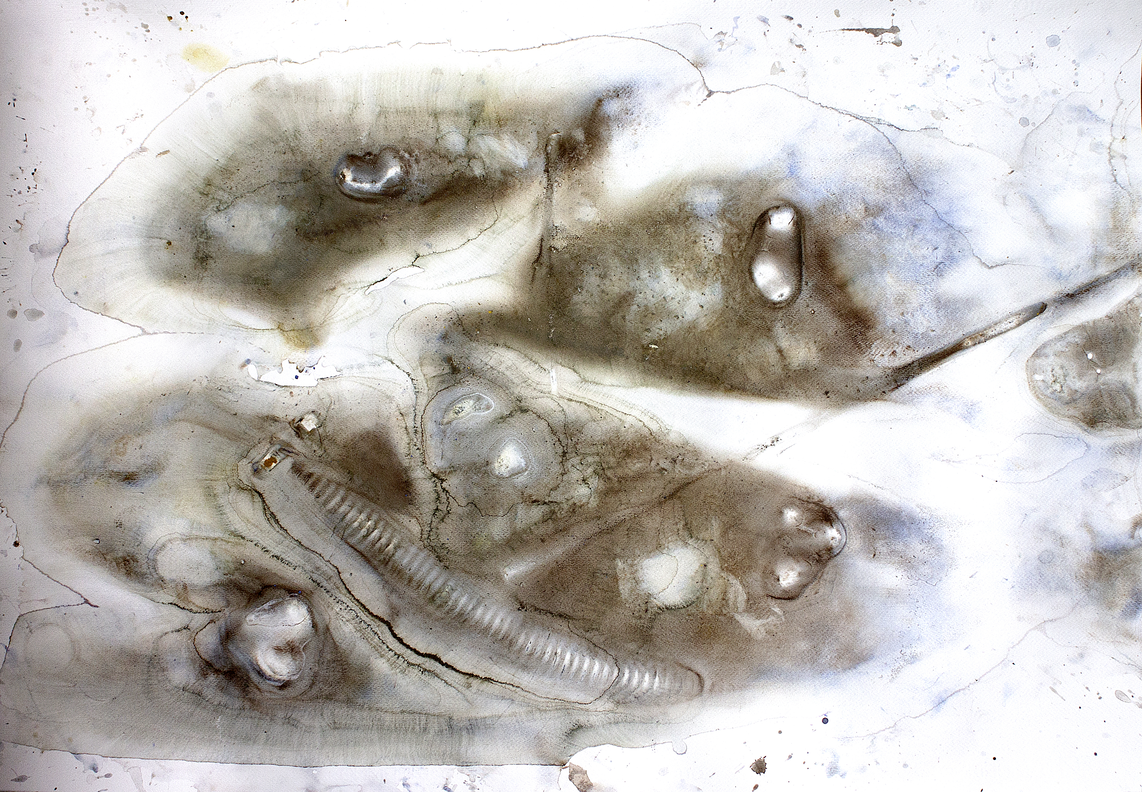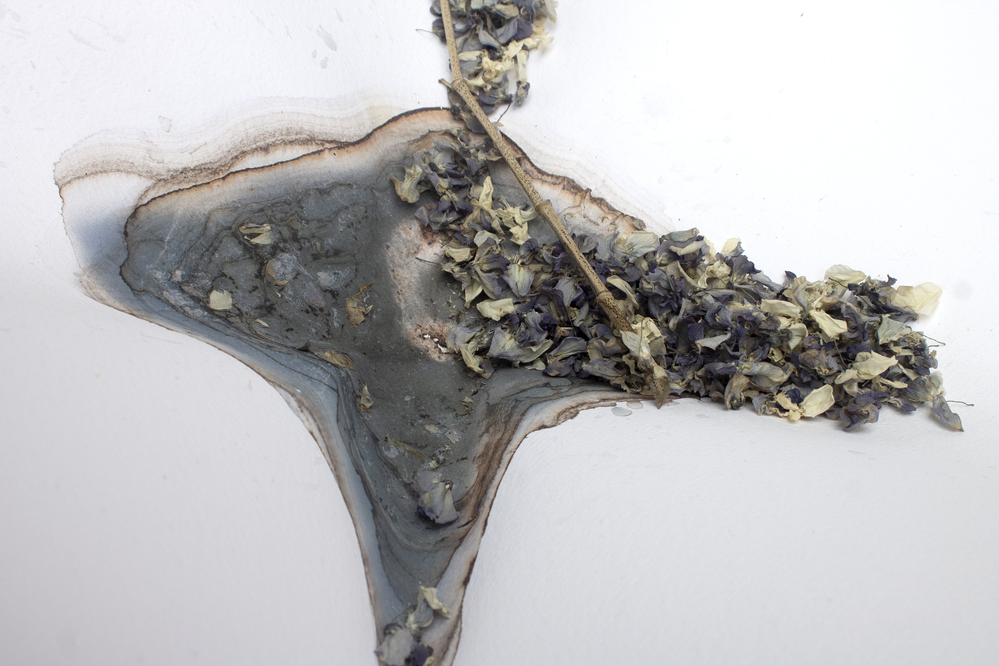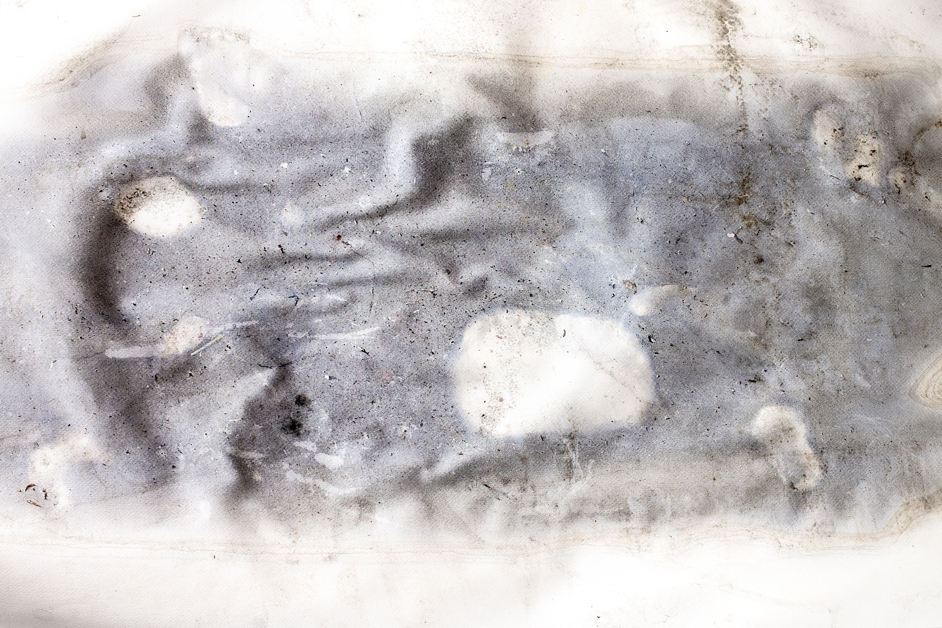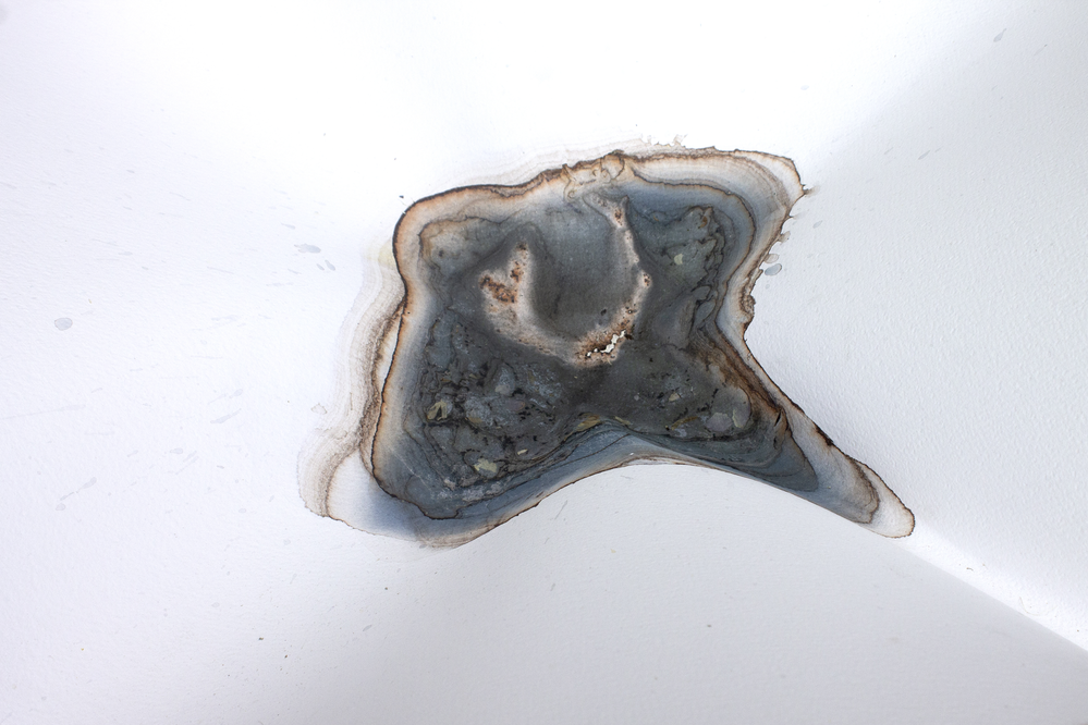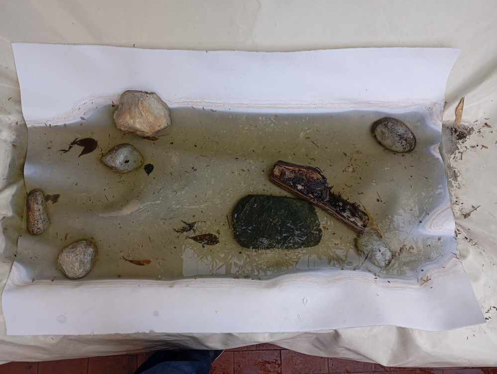 The sheet was placed on the fabric cover of a sofa, with stones positioned to apply localized pressure and introduce gravitational tension. Pigment was added along with water, creating a substantial pool that remained undisturbed for approximately three weeks. During this period, the pigment gradually settled, and the surrounding environment began to interact with the work. Notably, a small ecosystem formed around the sheet, including the presence of several ladybugs. Once the sheet was removed, the dried surface revealed layered traces of both material sedimentation and environmental interaction.