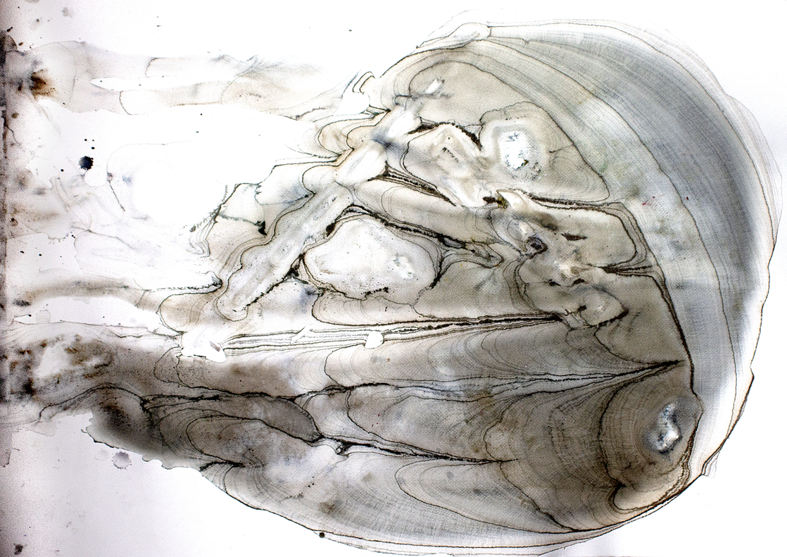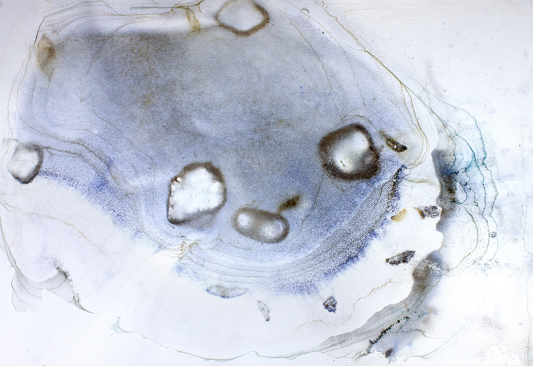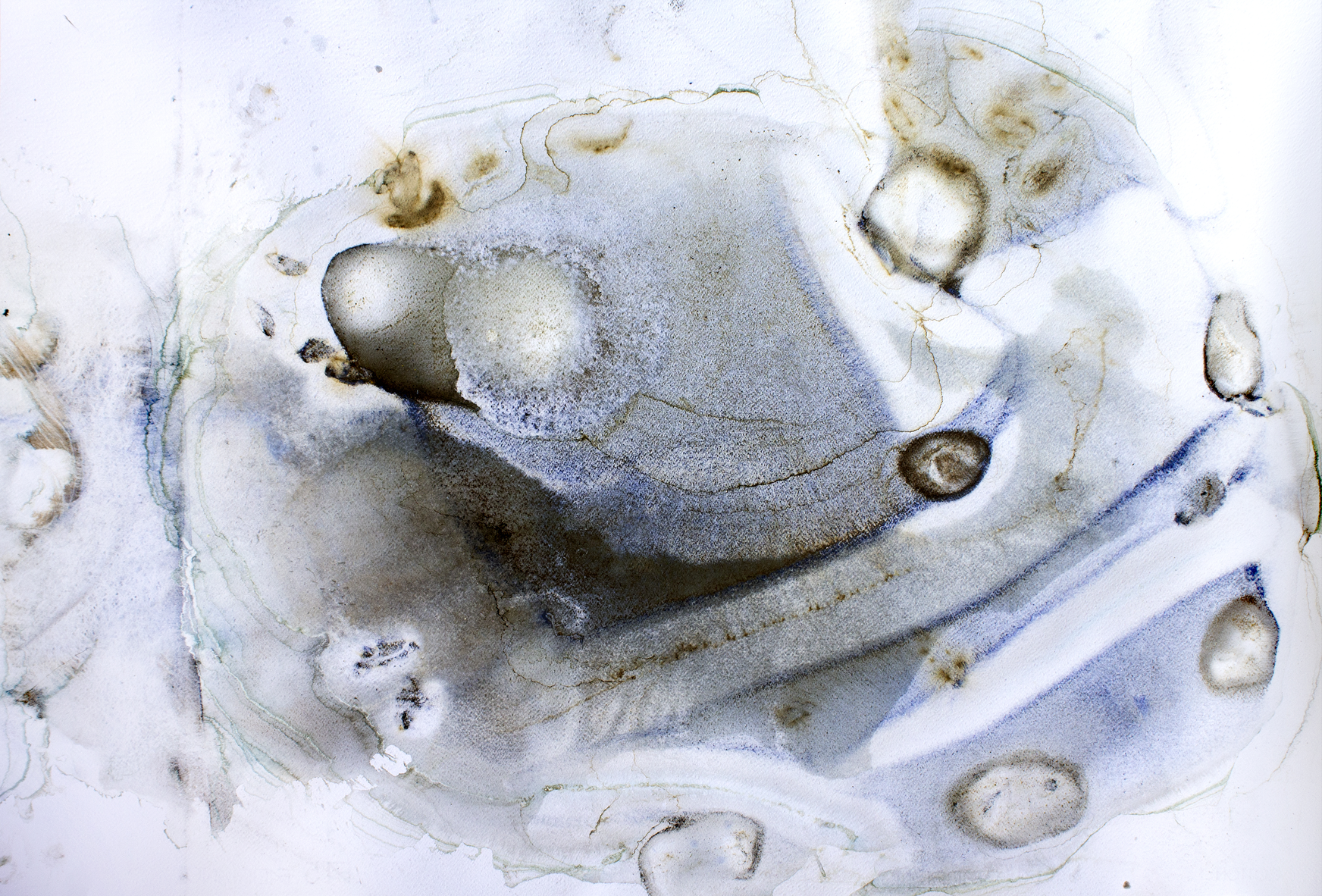 The sheet was placed on the fabric cover of a sofa, with stones positioned to apply localized pressure and introduce gravitational tension. Pigment was added along with water, creating a substantial pool that remained undisturbed for approximately three weeks. During this period, the pigment gradually settled, and the surrounding environment began to interact with the work. Notably, a small ecosystem formed around the sheet, including the presence of several ladybugs. Once the sheet was removed, the dried surface revealed layered traces of both material sedimentation and environmental interaction.