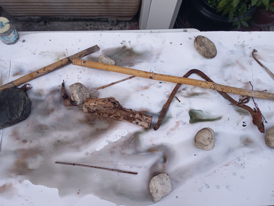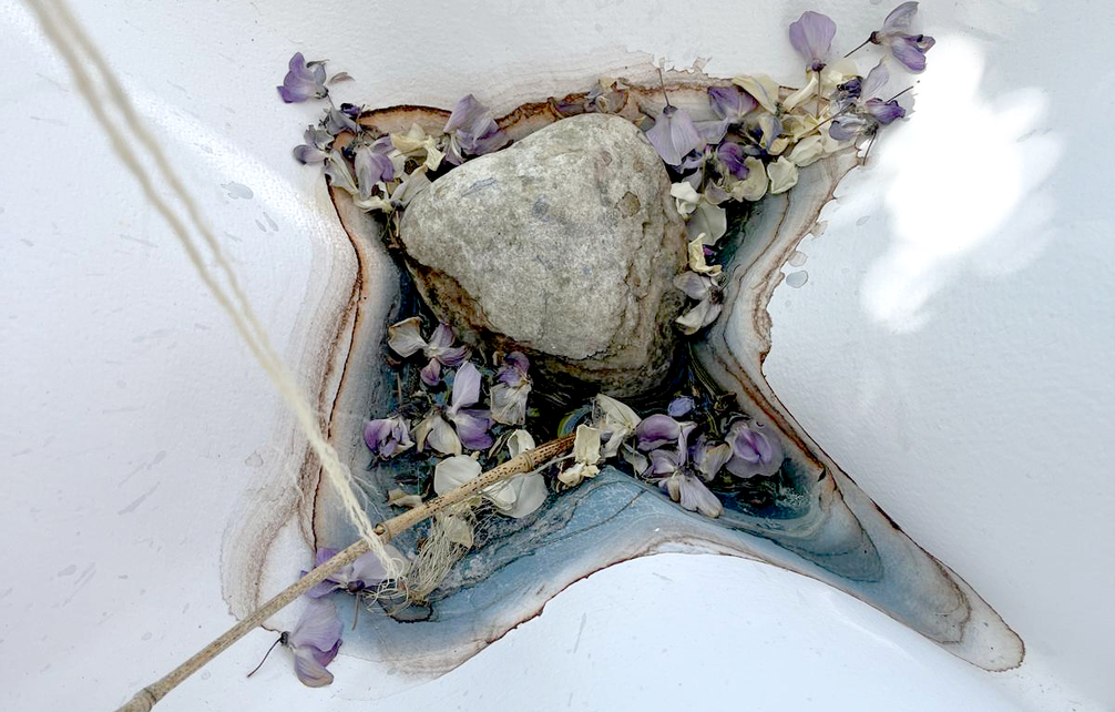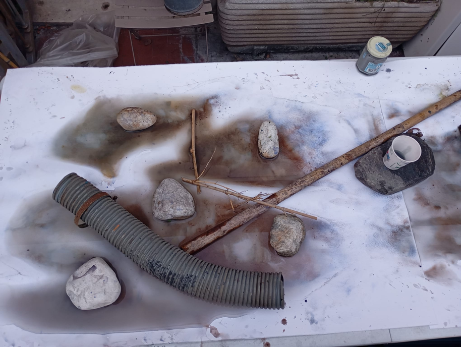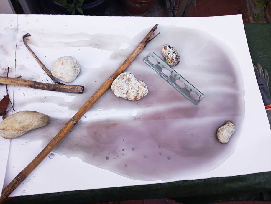 The image depicts the stage of the drying process of the sheets after exposure to atmospheric agents. The stones are used to retain water, thereby extending the drying time at those specific points. Furthermore, once removed, the stones leave a trace — a mark that establishes a relationship with the rest of the composition.