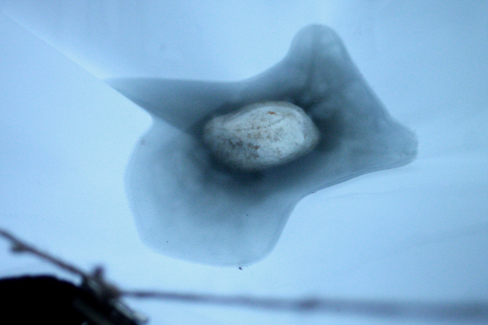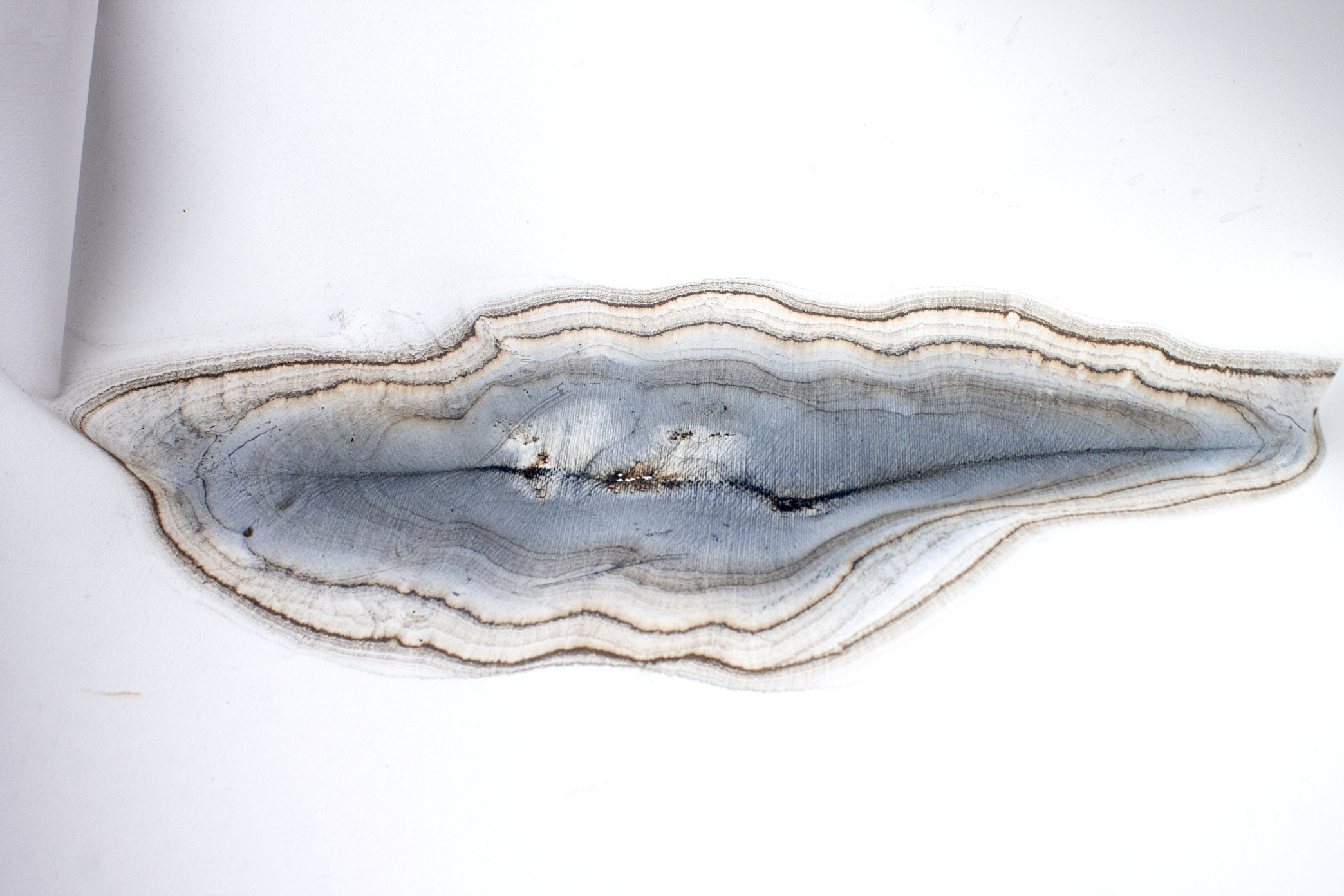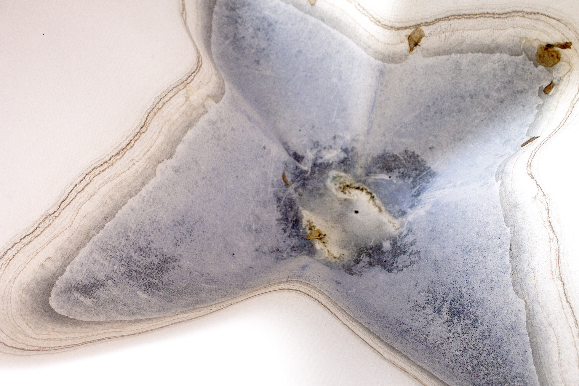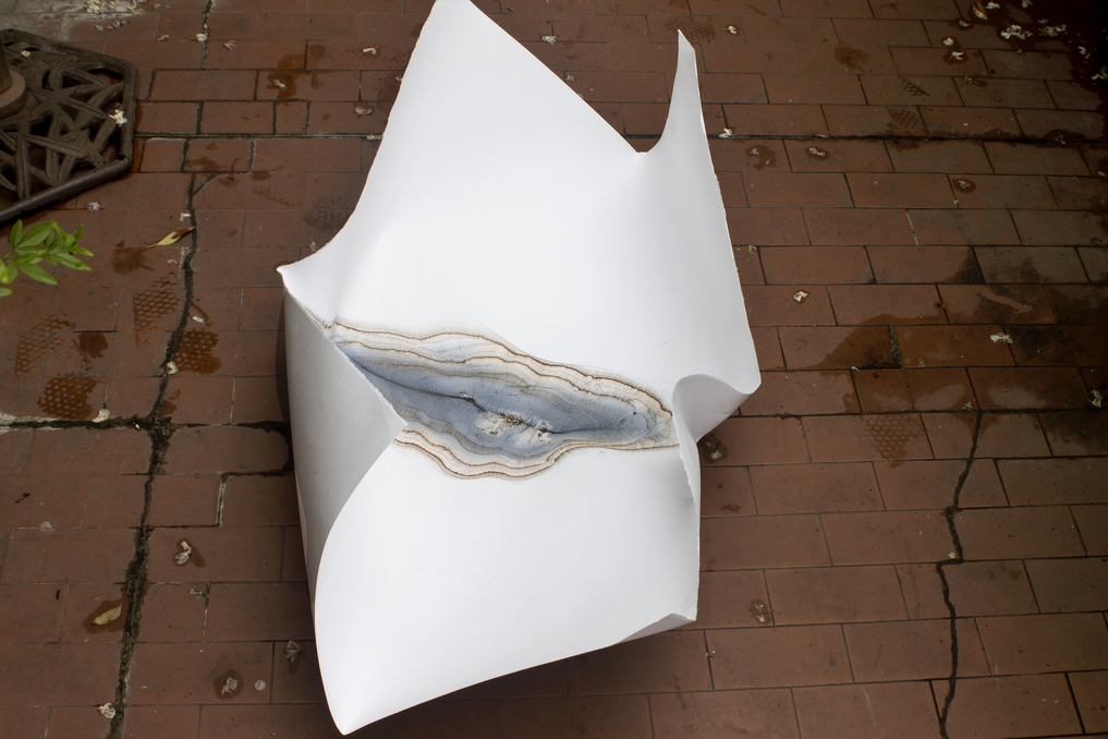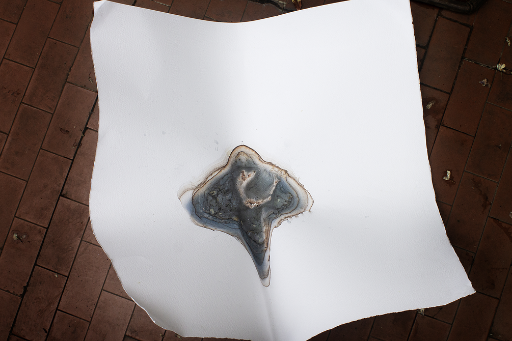In this case, the structure supporting the sheet remained stable throughout the process. The stone, placed at the centre of the sheet, exerted a downward force, pushing the water and pigment towards the middle, where they gathered within a cylindrical section. The drying process was completed without the sheet falling or experiencing significant external interference. I chose to leave the paper in its deformed state, allowing the work to acquire a sculptural quality and a physical presence shaped by the process itself.