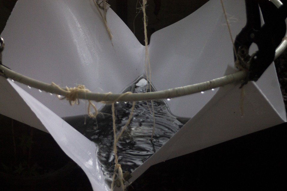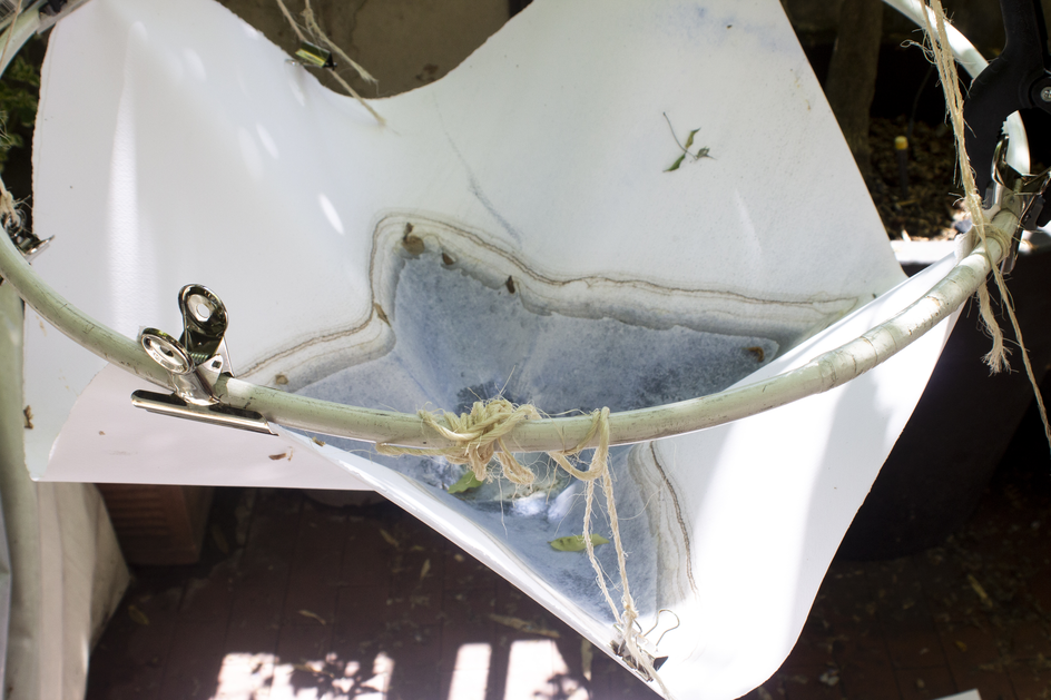 A square sheet was placed on the structure, containing a significant volume of water mixed with pigment. During the following week, the work was exposed to continuous rainfall. The structure remained stable until a particularly intense downpour caused it to collapse. The drying marks visible around the perimeter correspond to the gradual evaporation that occurred over the week, while the blue central area is the direct result of the fall — a concentration of pigment deposited upon impact.