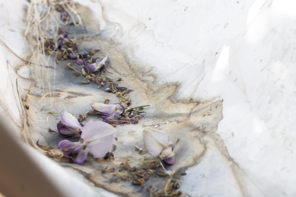 In this case, the structure with the suspended hoop remained stable, allowing the work to dry undisturbed over time. Meanwhile, some wisteria petals fell into the water, subtly altering the surface and texture of the work — a natural intervention that became part of the final composition.