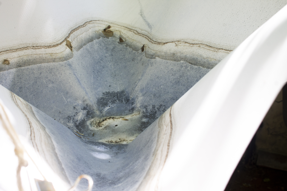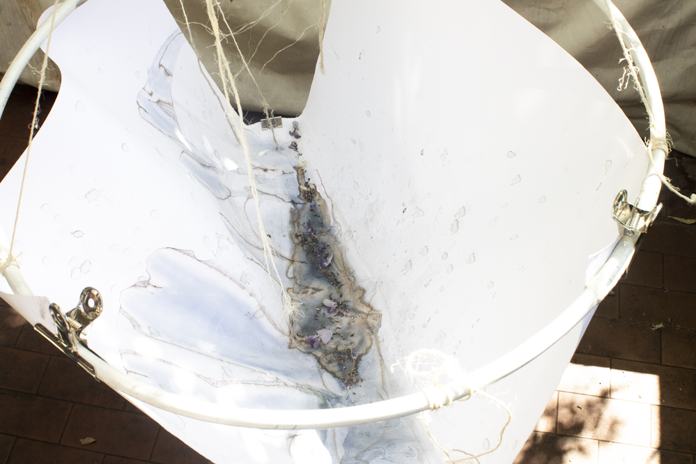 In this case, there is a change in the supporting structure: a rope, tied to an overhead handhold, horizontally anchors an industrial metal ring suspended downwards. From this ring hangs the sheet, with a stone placed at its centre, along with water and pigment. During the process, the work fell twice, leaving visible traces of the event — marks that became an integral part of the work’s narrative and material history.