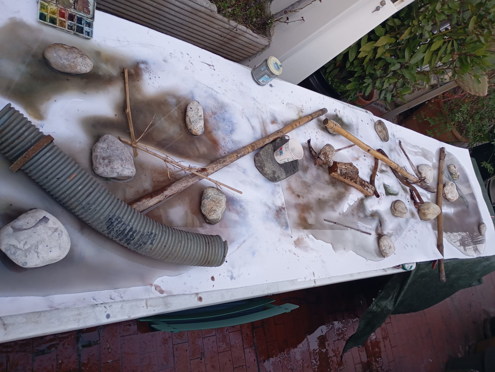The image shows the inclination of the table, intentionally created by the artist to simulate the flow of water — a movement that almost evokes the dynamic of a waterfall. As visible within the composition, industrial objects have been introduced alongside natural elements, generating a dialogue between the two.