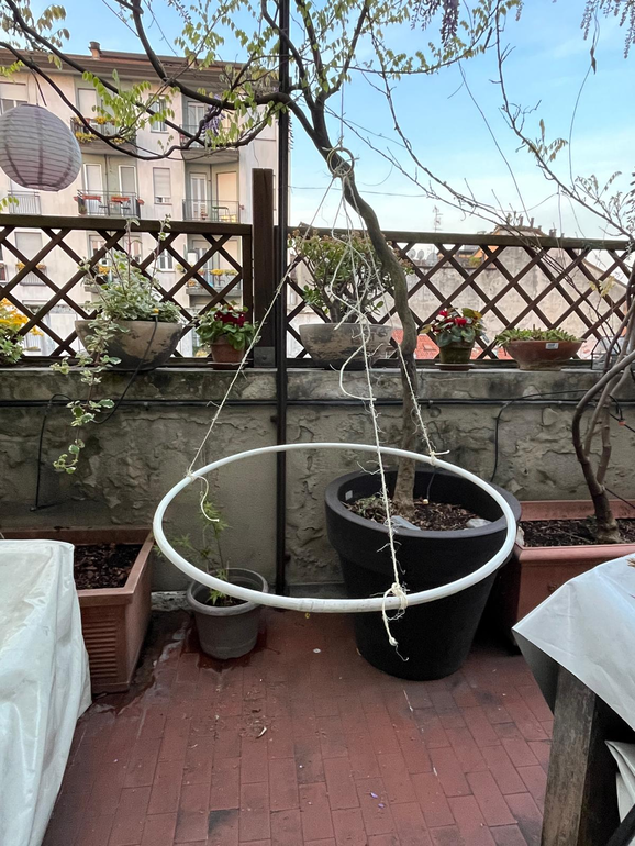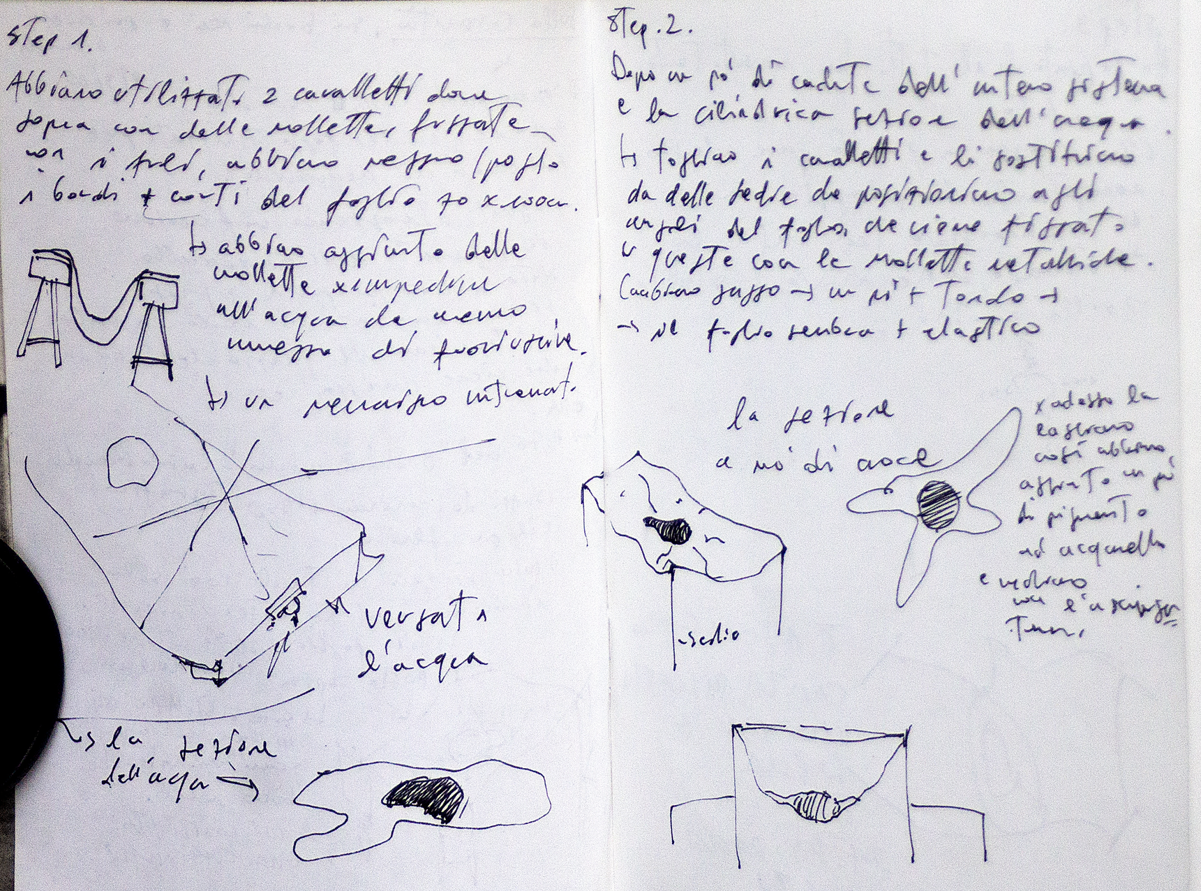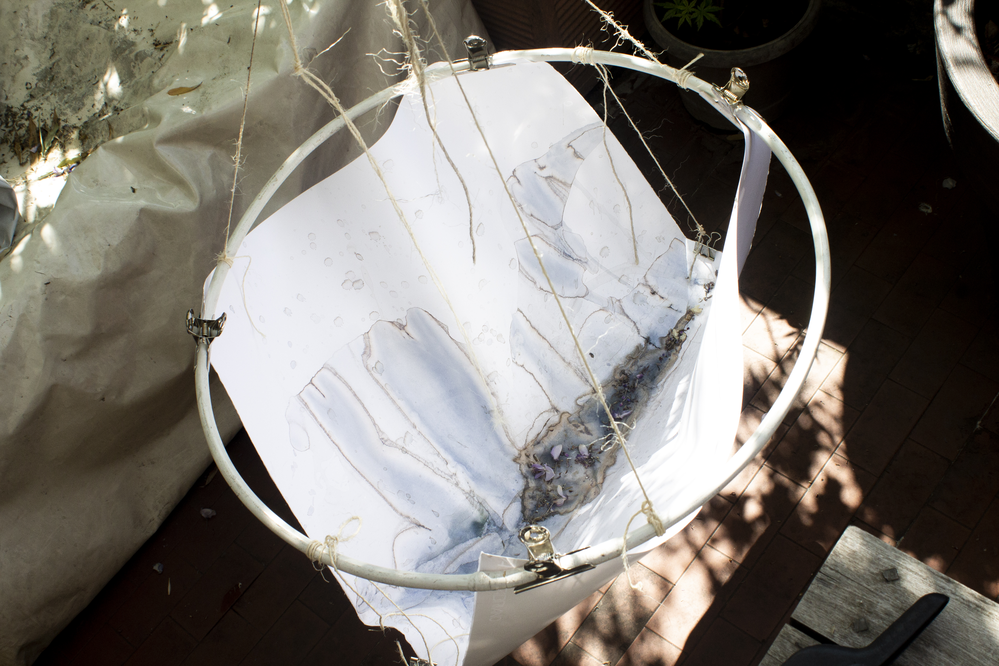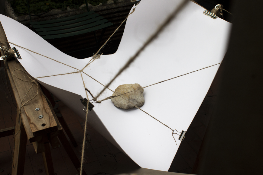 We used two easels with clothes pegs securing the sheet and tied and stretched by wires, we put/placed the shorter edges of the 70x100 cm sheet