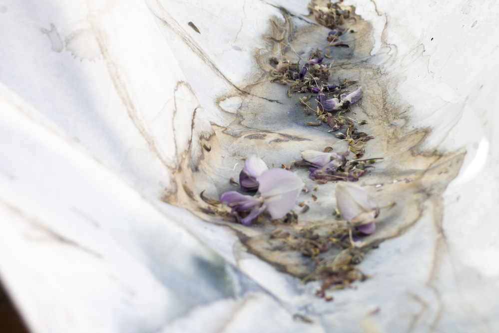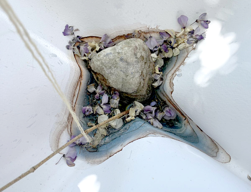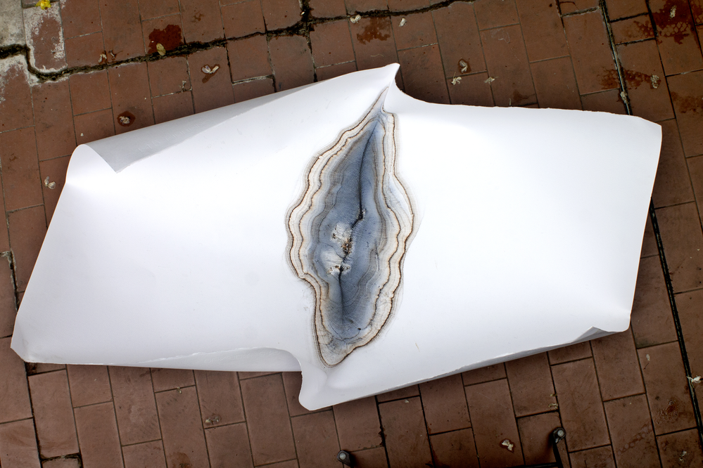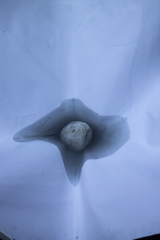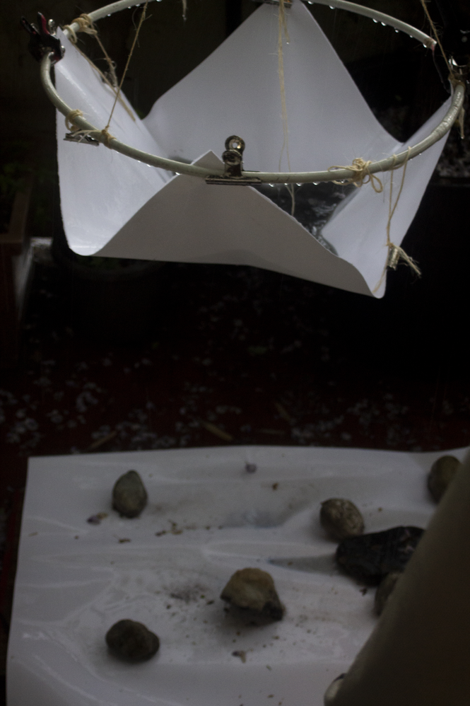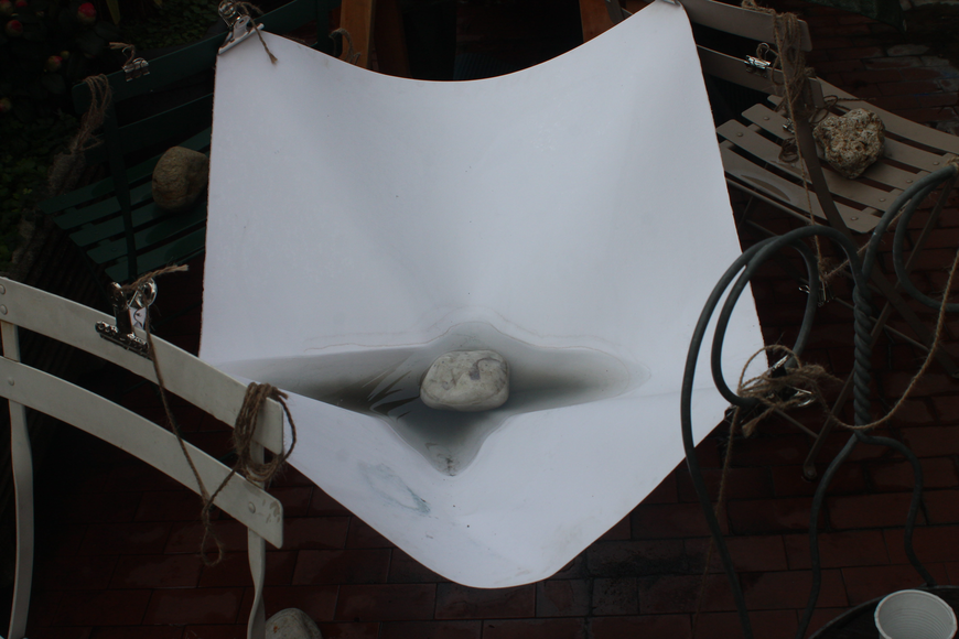 - Weathering influences the watercolour pigment that is distributed by the person, stones are placed or thrown on the sheet randomly and, due to their weight, influence the flow of the water input (as seen above).