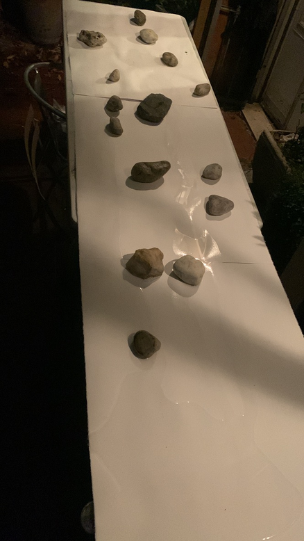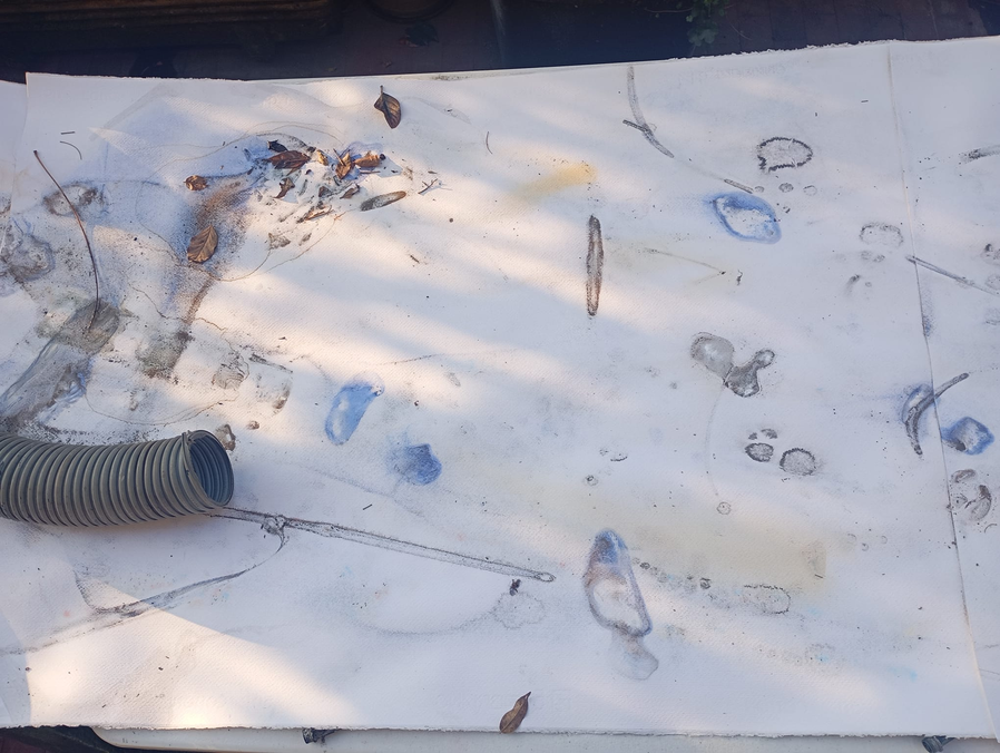 The elements introduced during the second phase of the process, just as the stones did in the first, leave visible traces of their passage — marks that record their interaction with the surface. The work is then left outdoors, with puddles of water and pigment still present, allowing the sheets to continue undergoing the effects of weathering and exposure to natural agents.