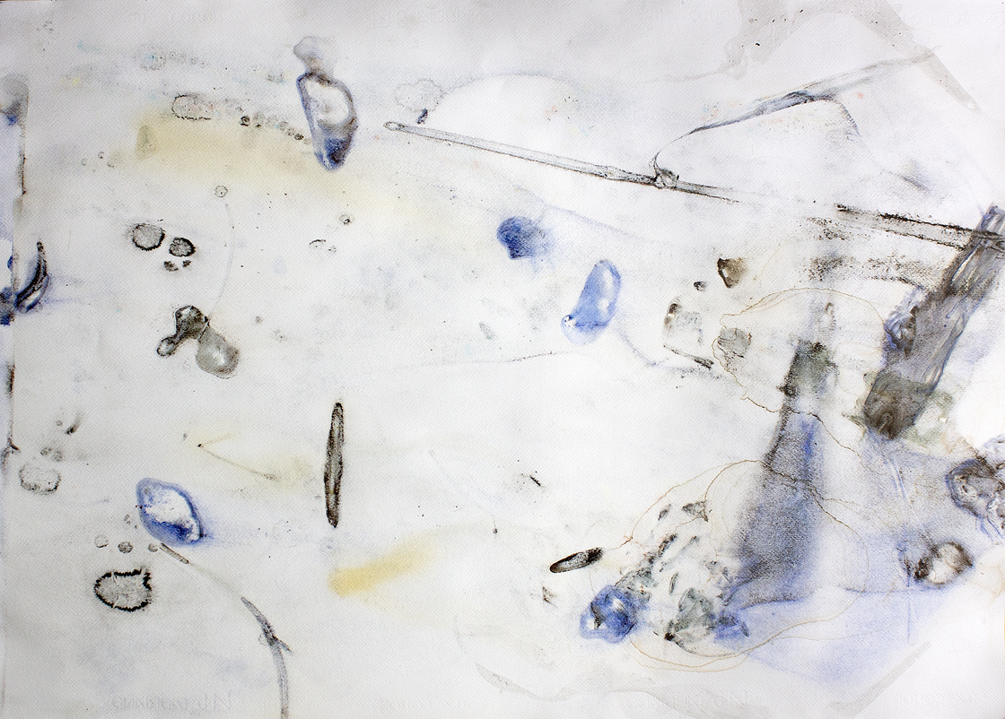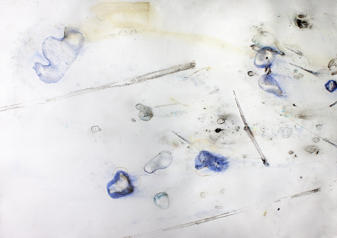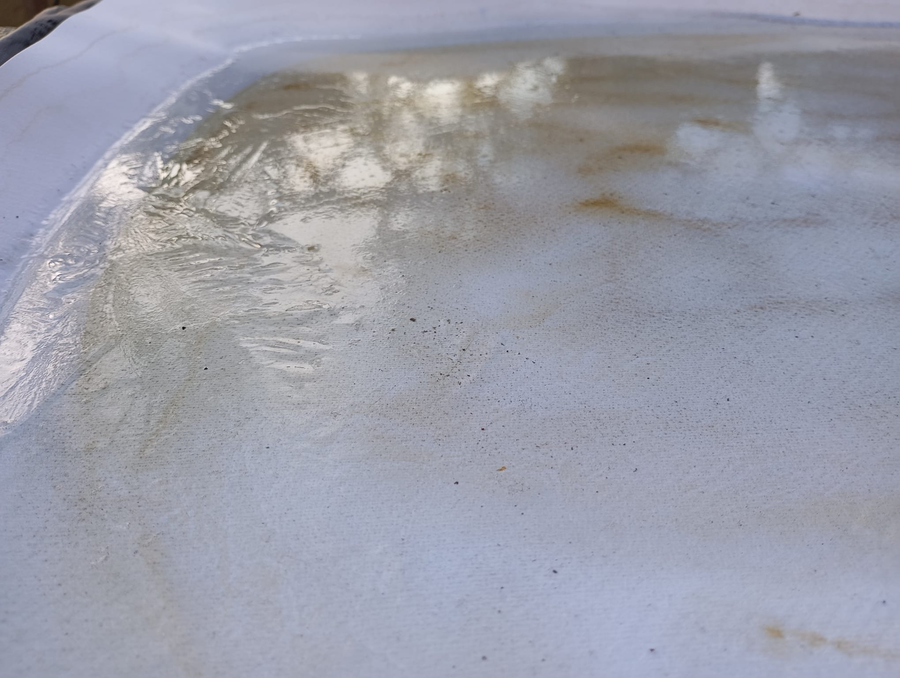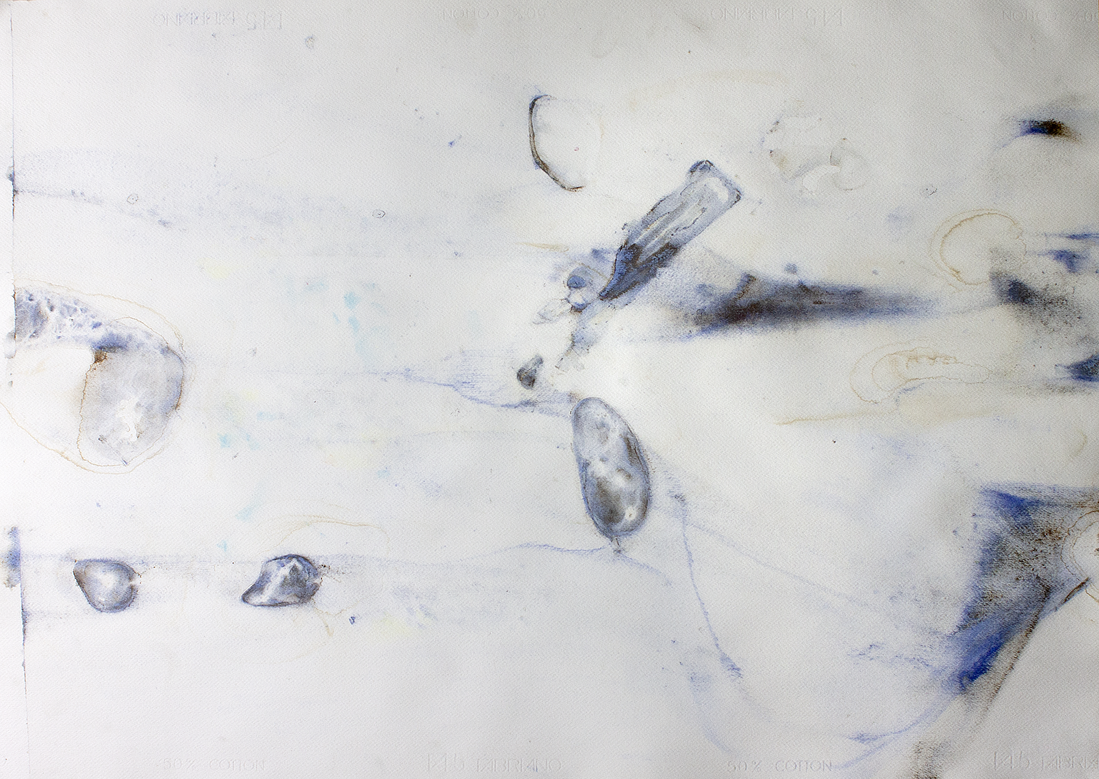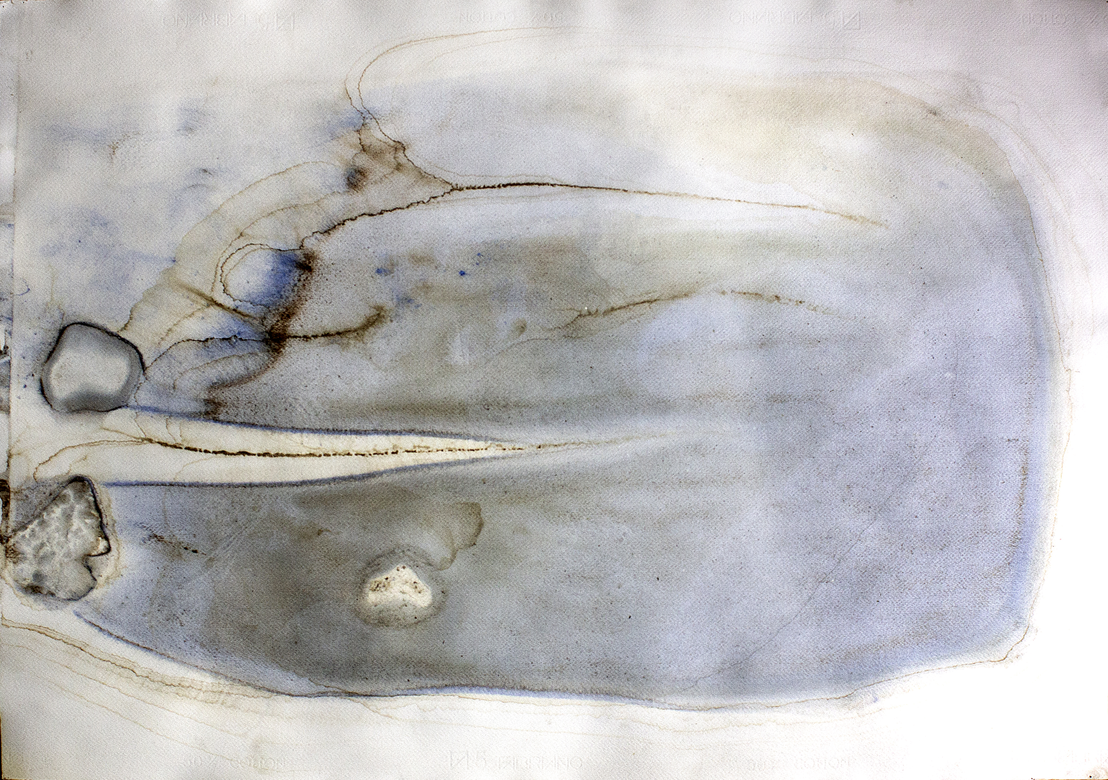 In this case, three sheets of 50% cotton paper were placed on an inclined plane. Stones were then positioned indeterminately across the surface, while water was poured from the highest point of the plane. The movement of the water — influenced by the weight and position of the stones — flowed downwards, gradually reaching the last sheet, which was placed on a horizontal, non-inclined surface. In this way, the water accumulated in a pool within this final sheet, creating a natural basin shaped by the process itself.